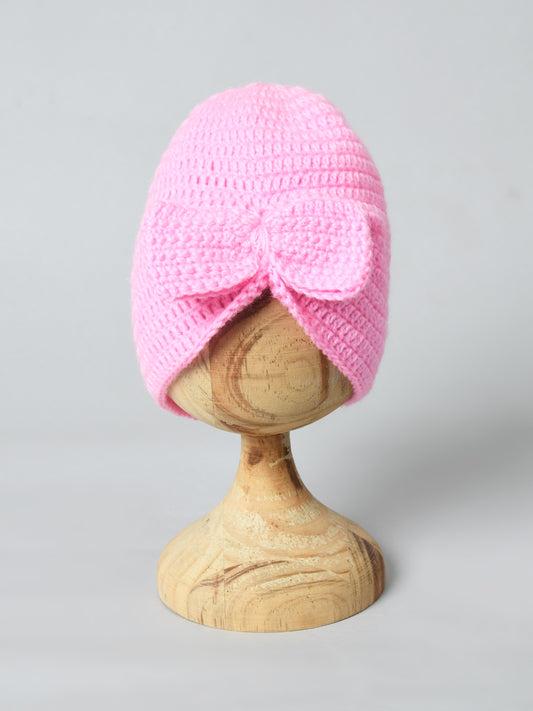 Pink & White Handmade Woollen Cap with Bow for Girls
