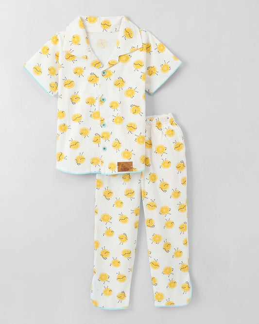 White Premium Cotton Half SleevesLemon Printed T-Shirt & Pyjama Set for Girls