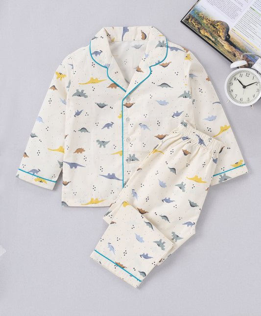 White Premium Cotton Full Sleeves Graphic Printed Collar Style Nightsuit for Boys & Girls
