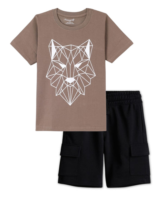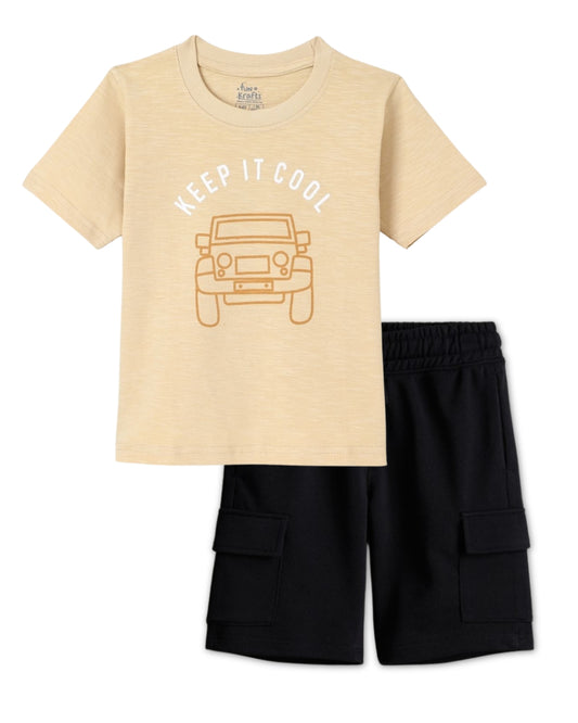 Car Printed Premium Cotton Half Sleeves Beige T-Shirt with Black Shorts for Boys