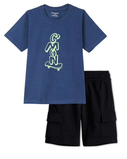 Graphic Printed Premium Cotton Half Sleeves Blue T-Shirt with Black Shorts for Boys
