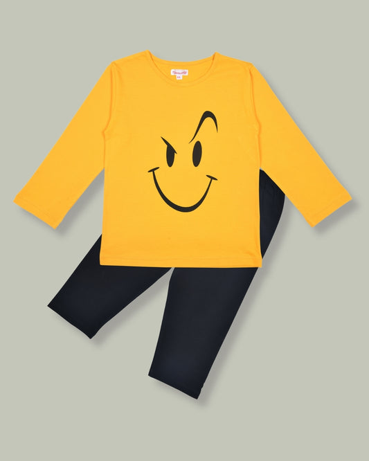 Yellow & Black Smiley Printed Cotton Night Suit for Kids