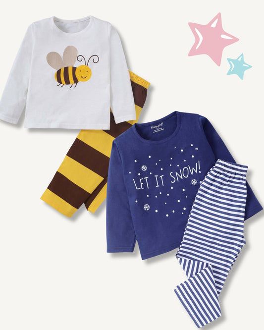 Star Printed Premium Cotton Full Sleeves White T-Shirt with Blue Pyjama for Boys & Girls