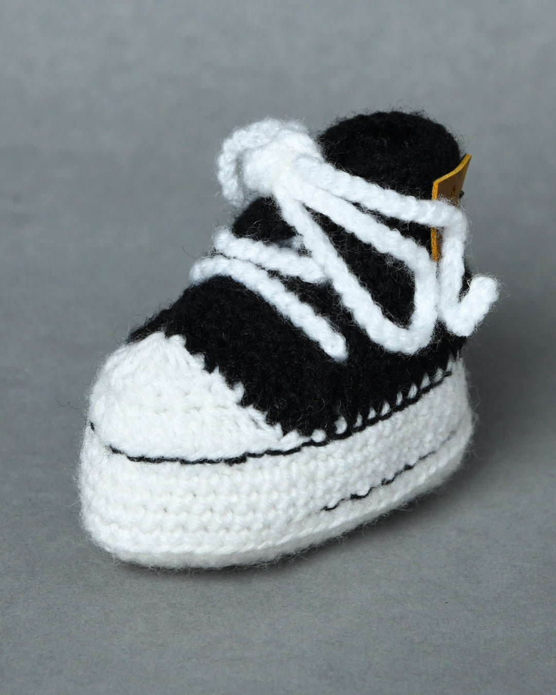 These black and white handmade woollen sneakers are the perfect mix of style, warmth, and handcrafted charm for kids. Made from soft acrylic wool, they offer a cozy, snug fit that keeps little feet toasty during cold weather while allowing flexibility for movement. The monochrome color combination gives them a modern, sporty look, making them ideal for both indoor wear and winter outings.