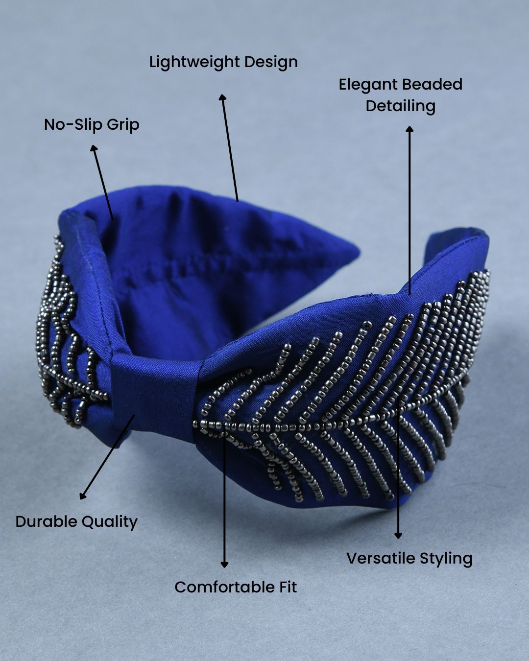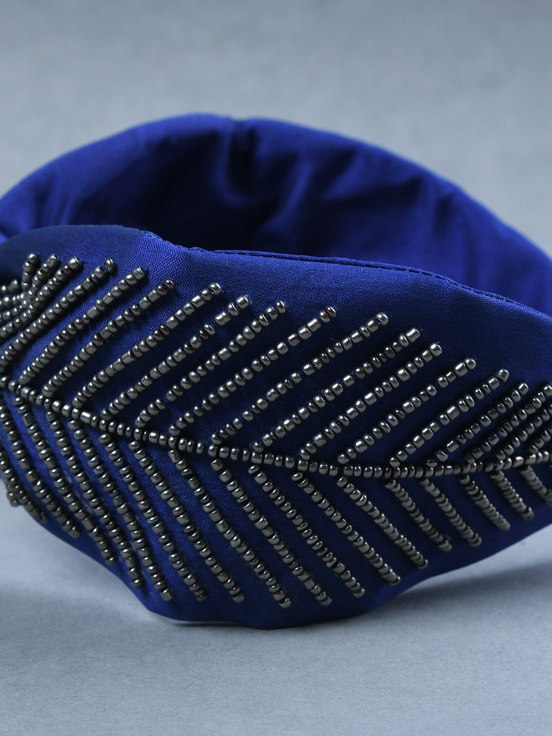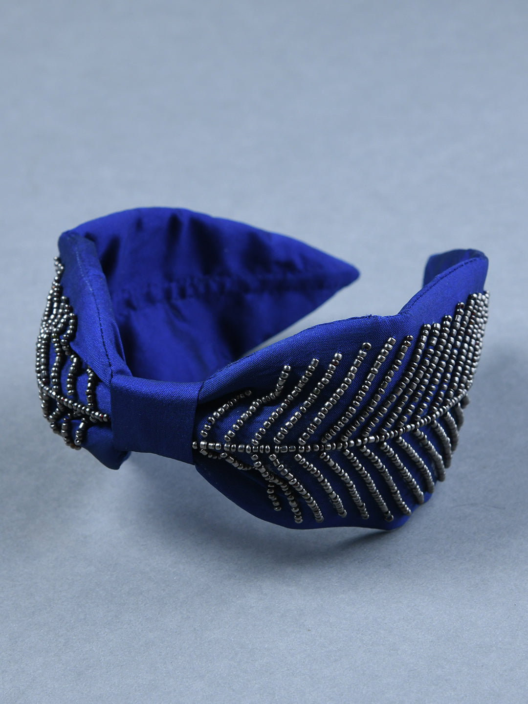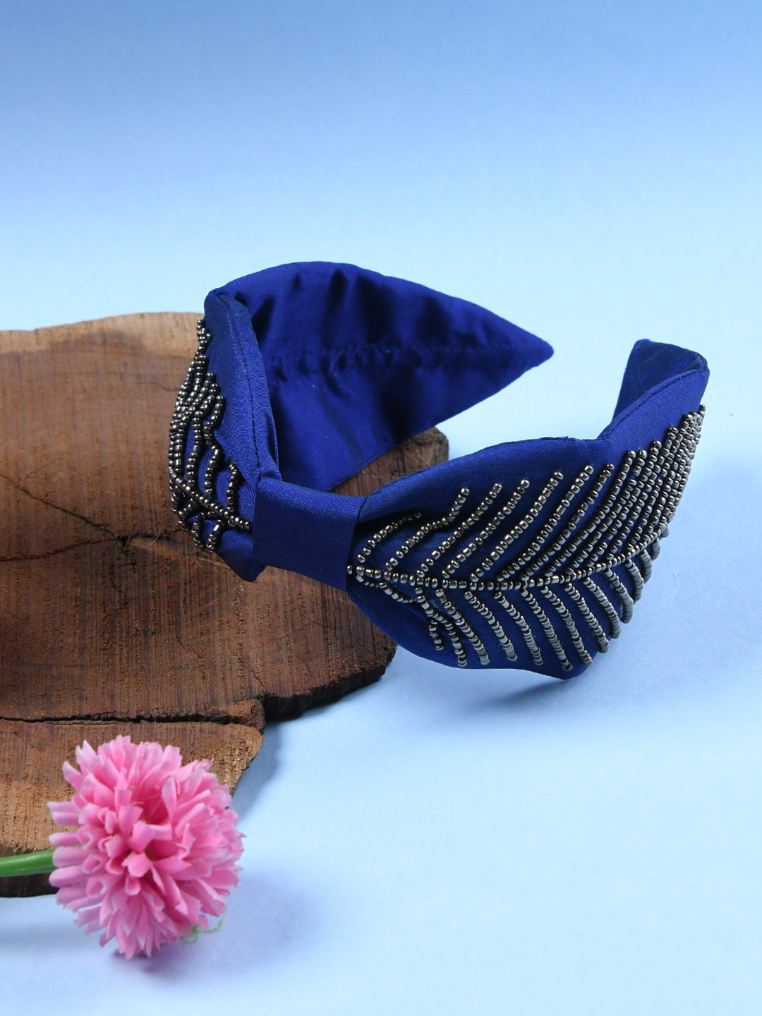 Blue Beaded Leaf Embellished Knotted Free Size Hair Band