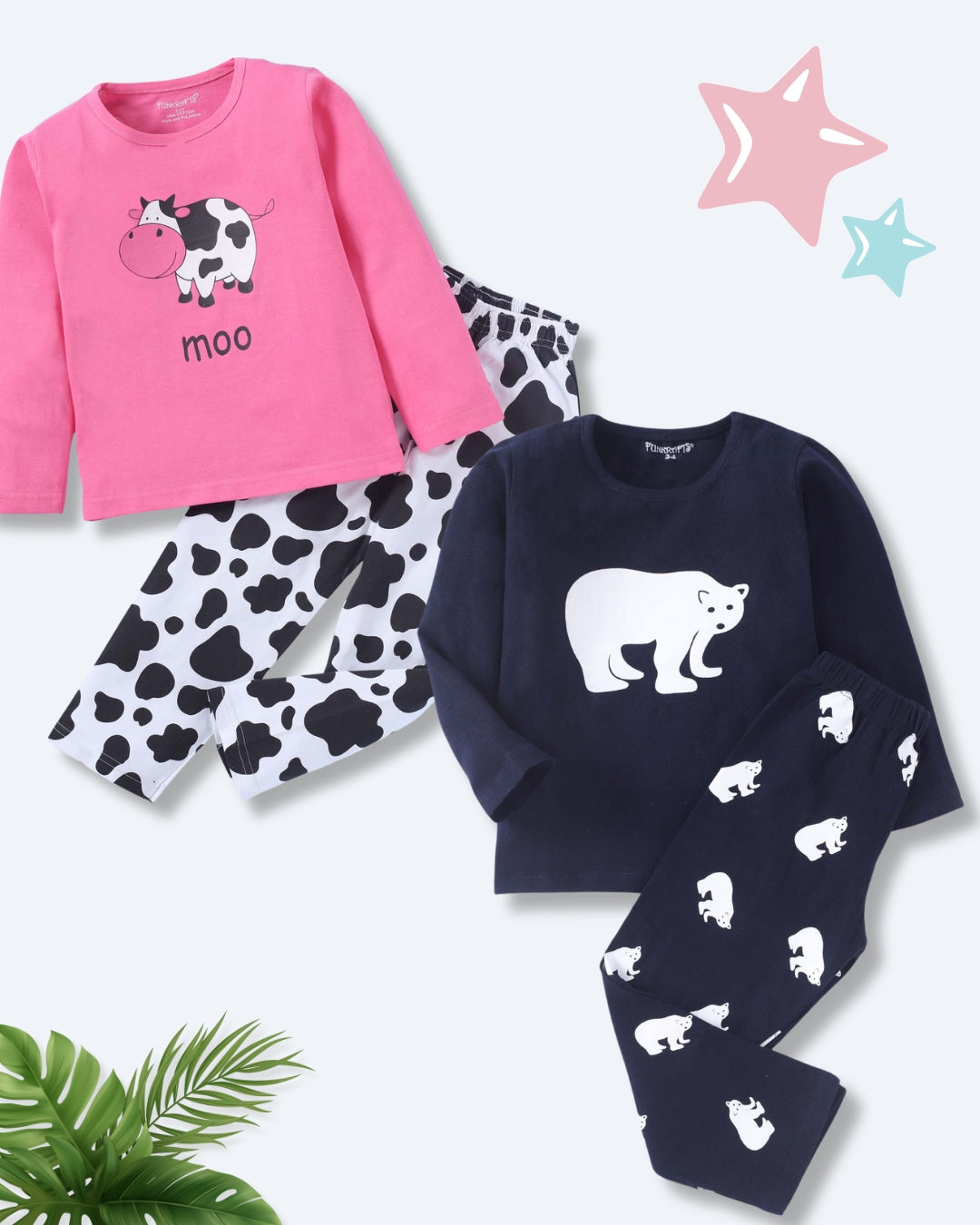 Infuse bedtime with whimsy using our Blue & Pink Pure Cotton Nightsuits for girls. Featuring adorable bear and cow prints, these knitted full sleeves sets ensure comfort and style. Crafted from premium cotton, they promise peaceful nights and joyful dreams. Pack of 2 for versatile bedtime options!