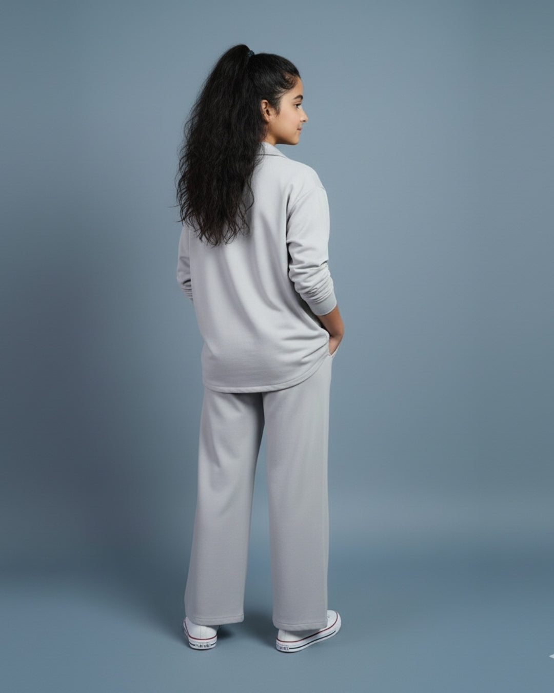 Elevate your little girl’s everyday look with this Blueish Grey Premium Cotton Full Sleeves Solid Lapel Collar Clothing Set for Girls. Made from ultra-soft, breathable premium cotton, this clothing set for girls offers unmatched comfort and effortless style all day long. The lapel collar adds a touch of elegance, while the full sleeves make it perfect for year-round wear.