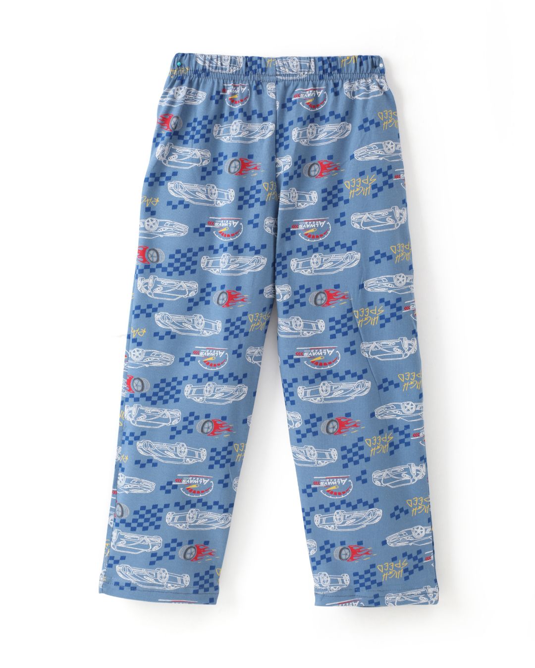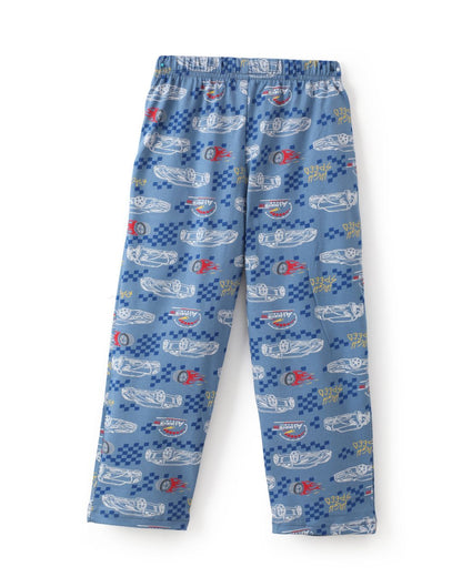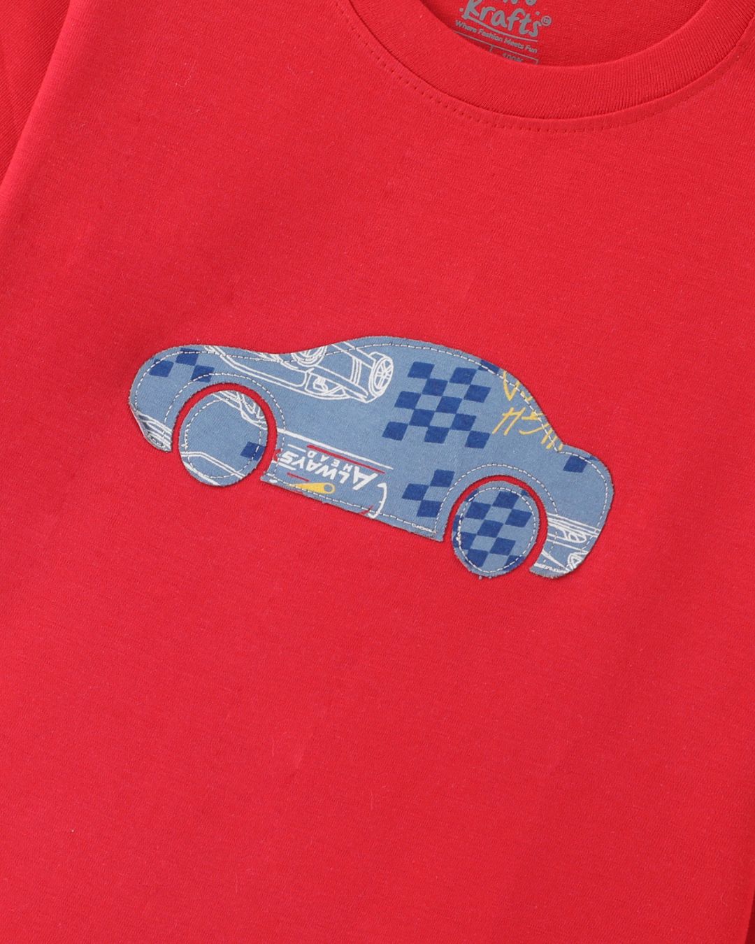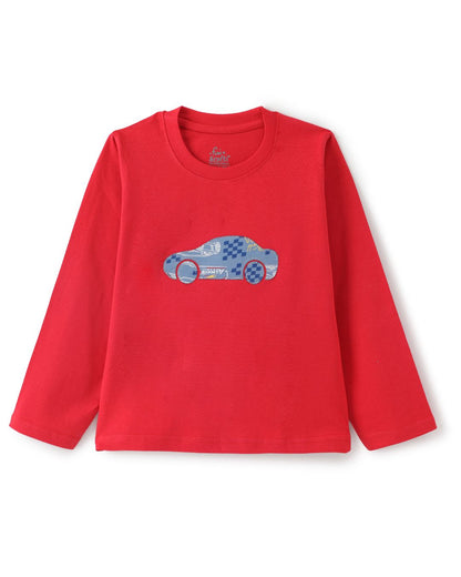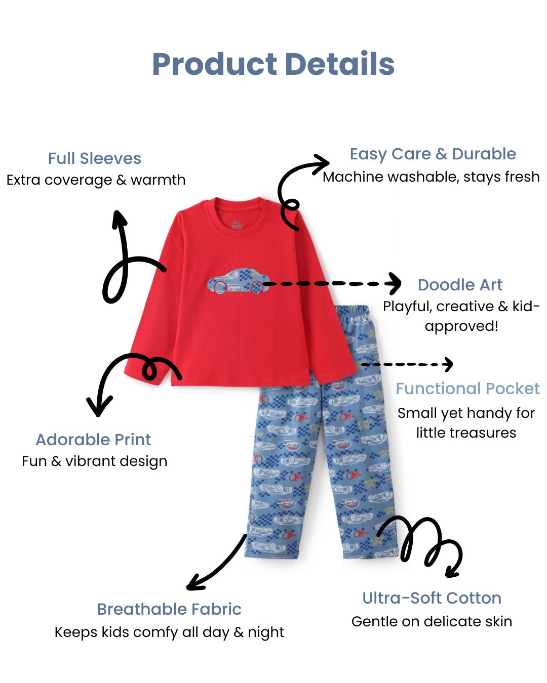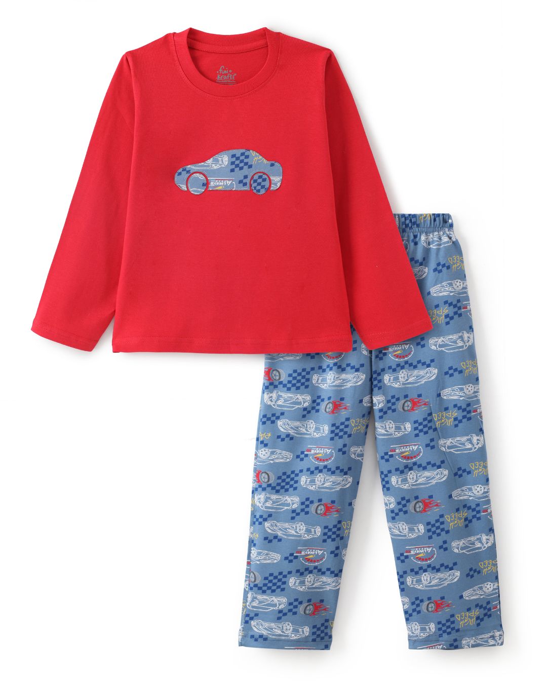 Car Printed Premium Cotton Full Sleeves Red T-Shirt with Blue Pyjama for Boys