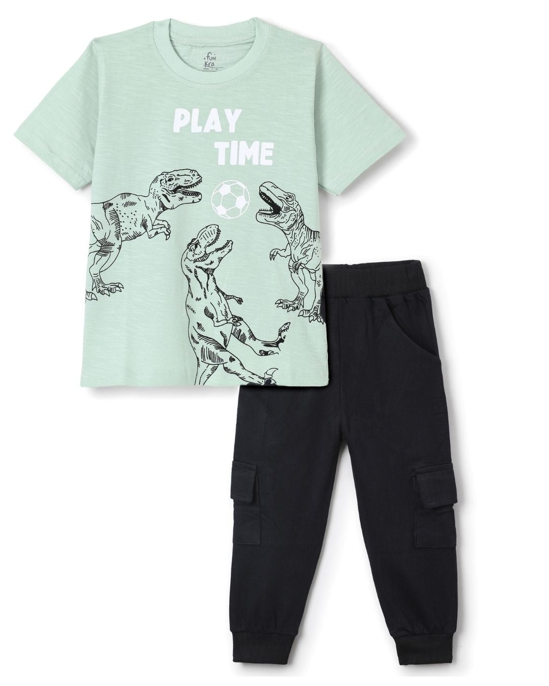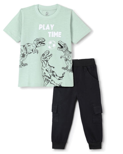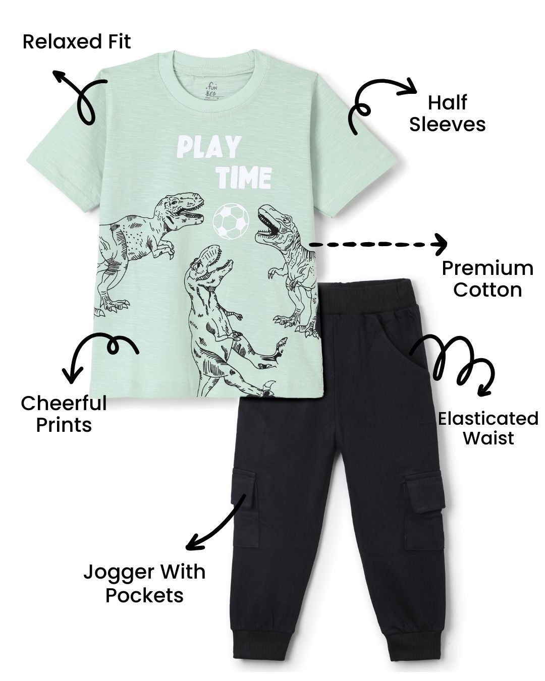 Dinosaur Printed Premium Cotton Half Sleeves Green T-Shirt with Black Jogger for Boys
