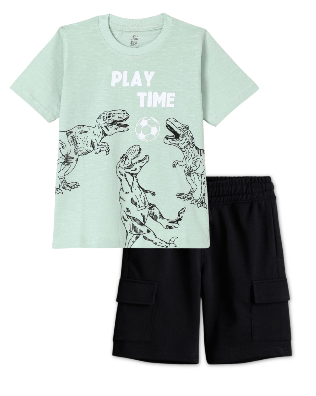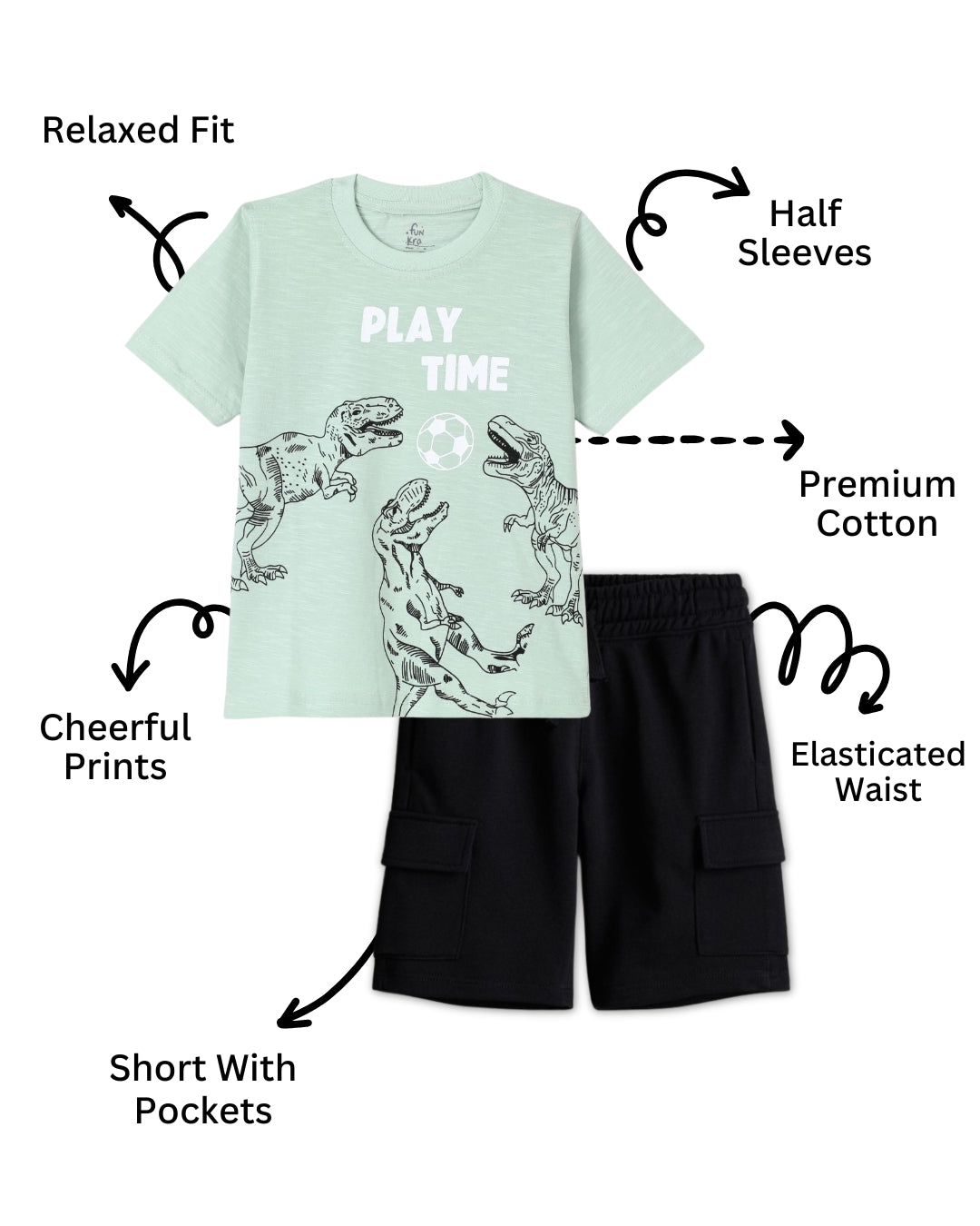 Dinosaur Printed Premium Cotton Half Sleeves Green T-Shirt with Black Shorts for Boys