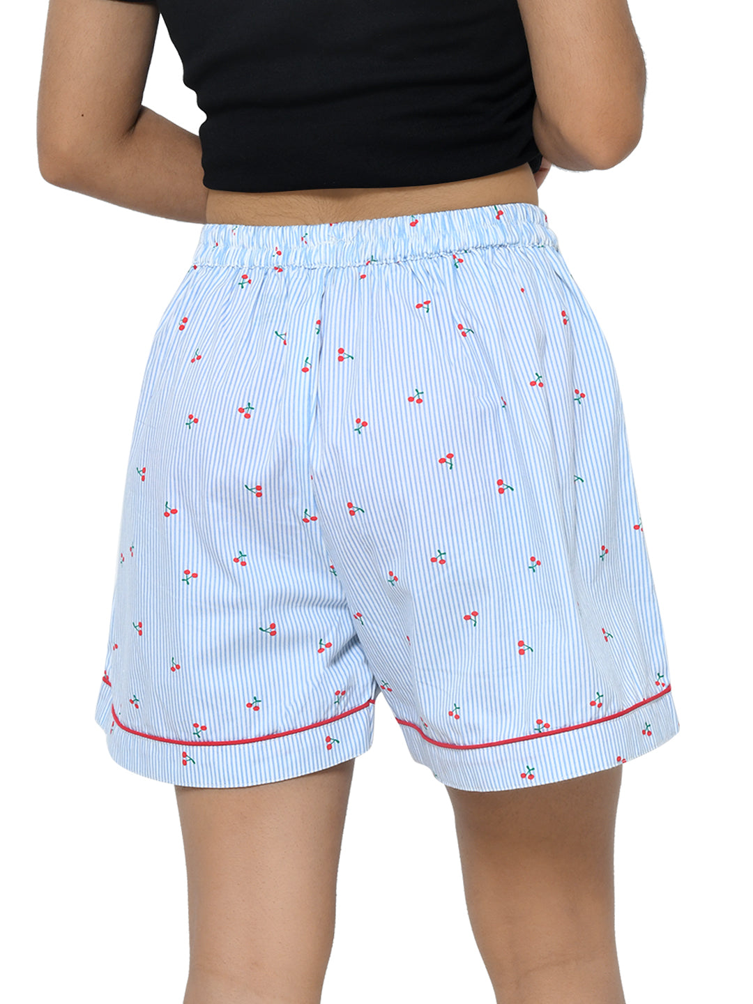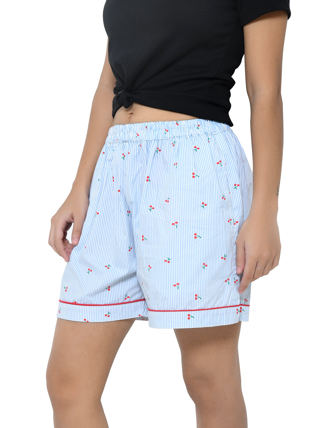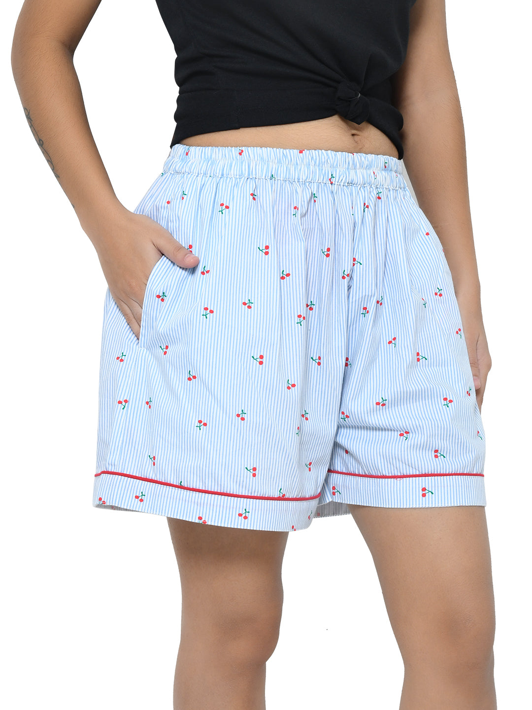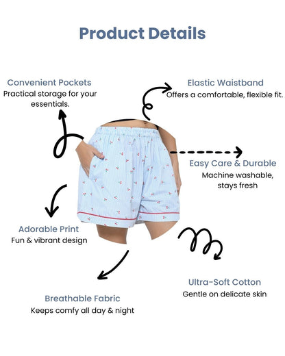 Brighten up your casual style with these blue knee-length shorts featuring a playful cherry print. Made from soft cotton, they offer comfort & convenience with functional pockets for your essentials.
