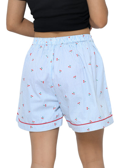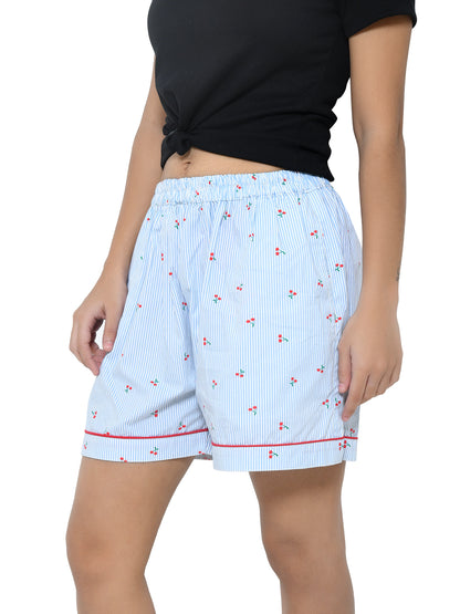 Funkrafts Cotton Woven Knee Length Cherry Printed Shorts With Pockets - Blue