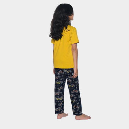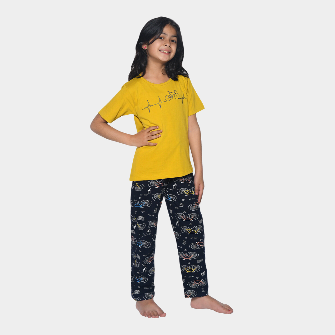 This fun and trendy girls mustard & navy bicycle printed night suit by Funkrafts is sure to add some personality to your bedtime routine. Made with 100% pure cotton, with a relaxed fit.