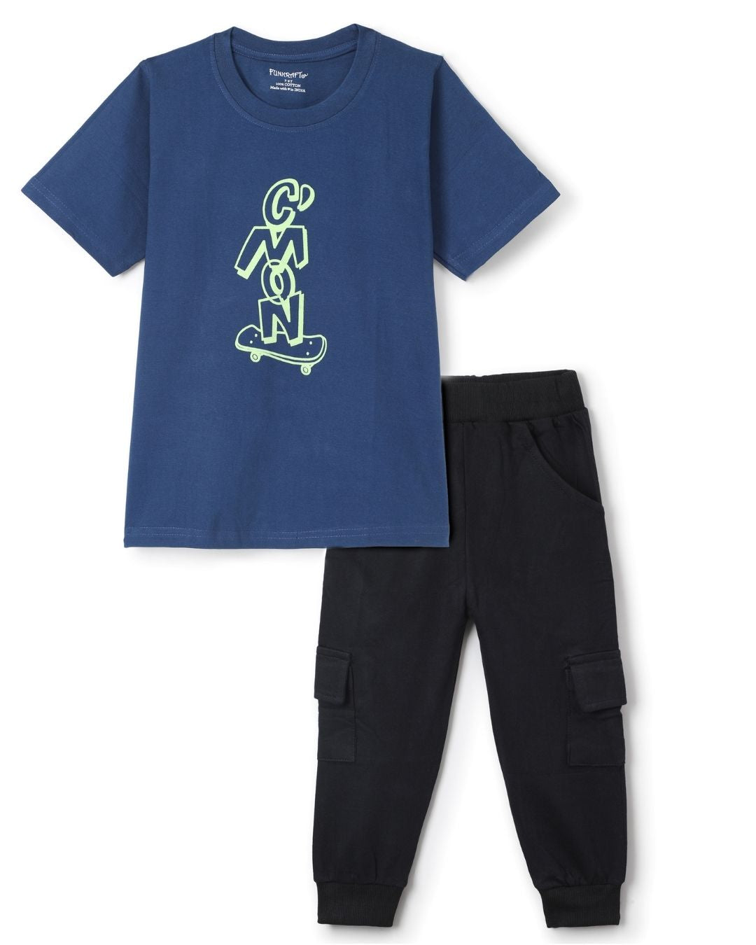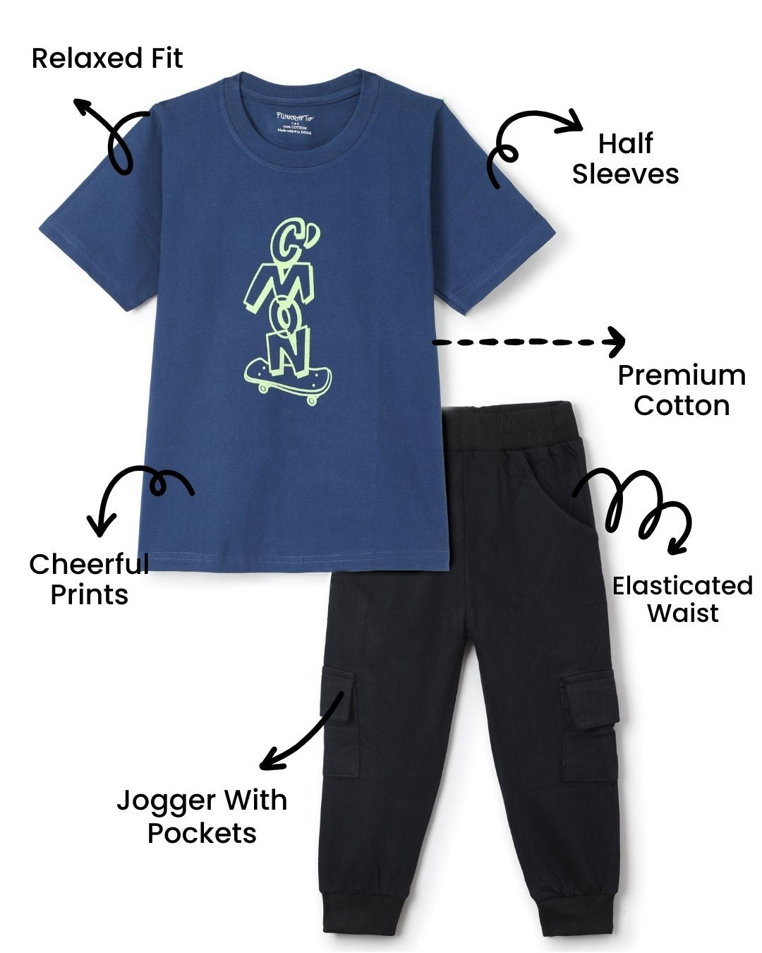 Graphic Printed Premium Cotton Half Sleeves Blue T-Shirt with Black Jogger for Boys