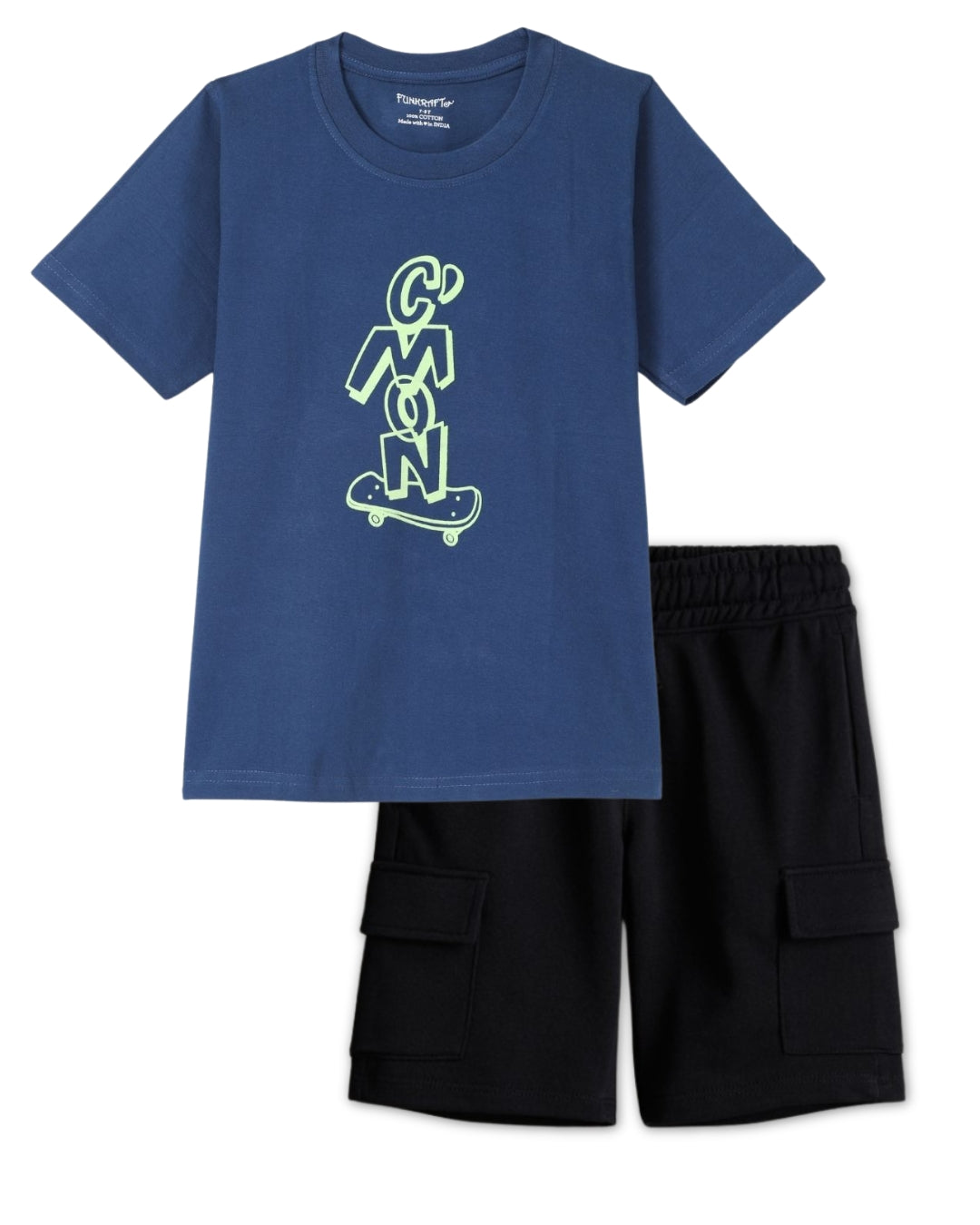 This cool Shorts set for boys features a trendy blue graphic printed T-shirt and black Shorts with pockets, perfect for creating a laid-back yet stylish look. Made from premium cotton, this t-shirt & Shorts for boys offers a comfortable fit for any occasion, from casual outings to lounging at home. The bold graphic print adds a touch of fun, making this clothing set for boys stand out. Whether for a day at the park or a relaxed day indoors, this is the ultimate loungewear for boys. The pockets in the Shorts add both style and practicality, ideal for keeping essentials close by, especially when on the move, making it a great airport look for boys.