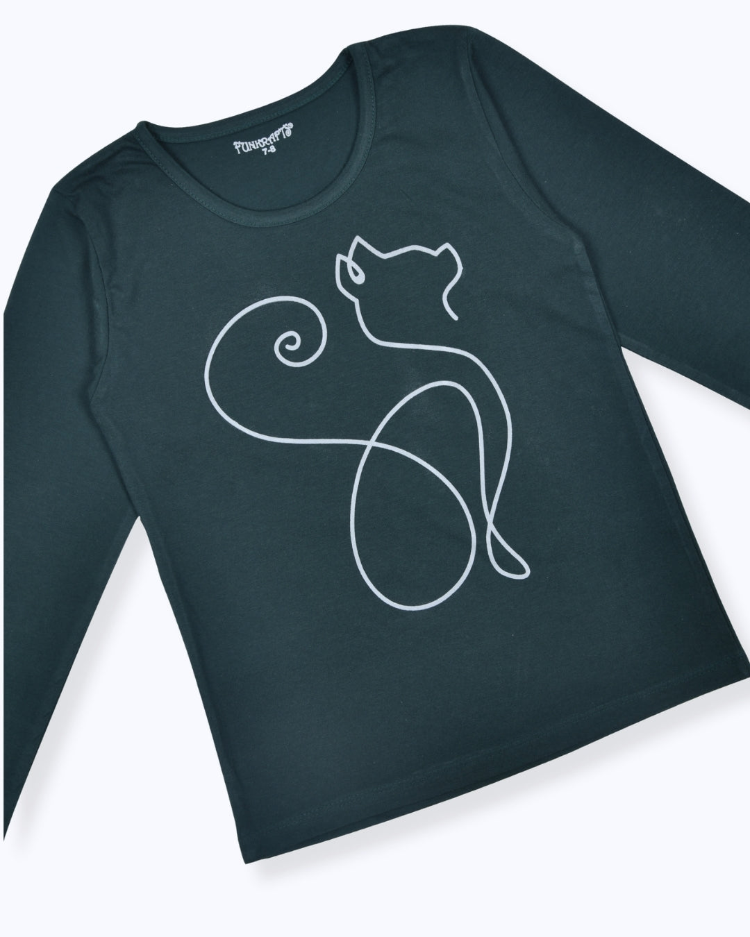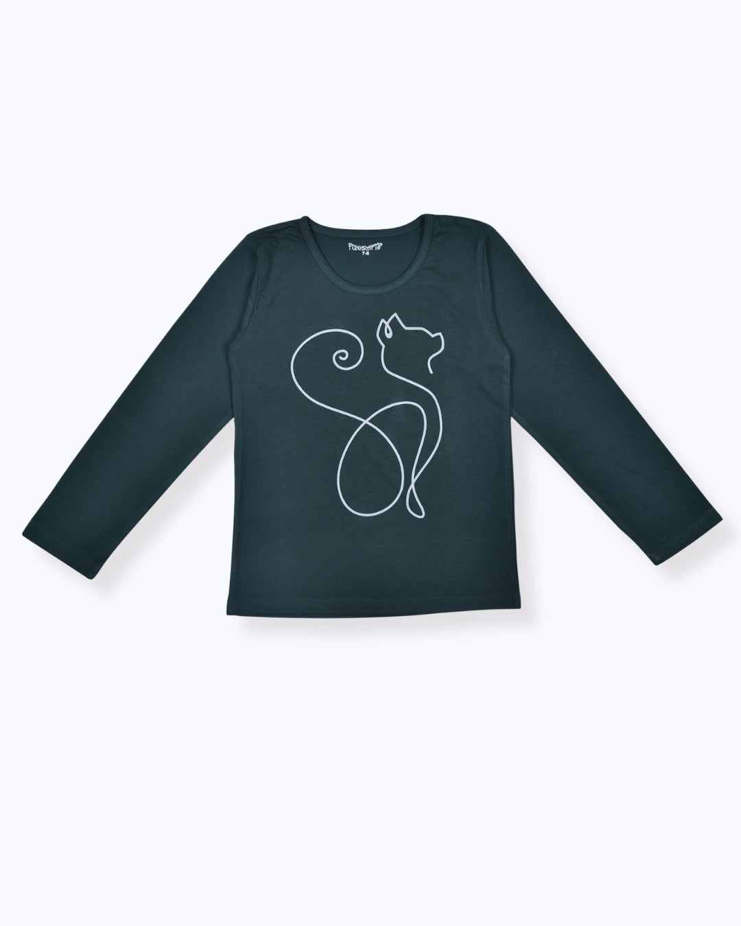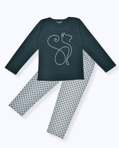 Green & Grey Cat Printed Cotton Girls Nightwear