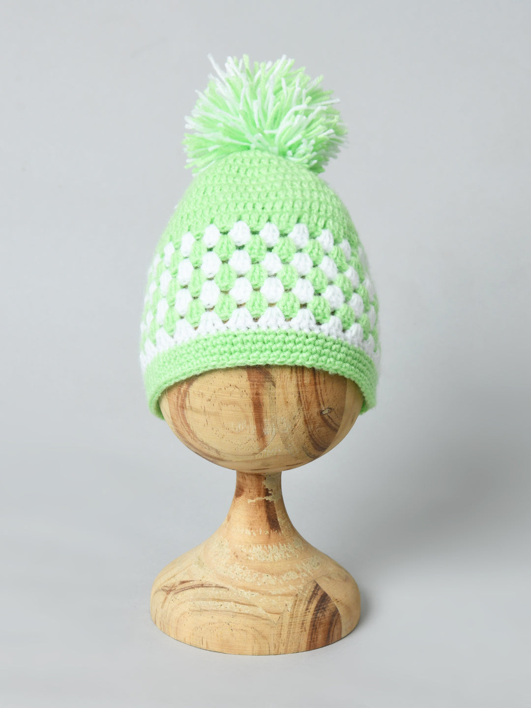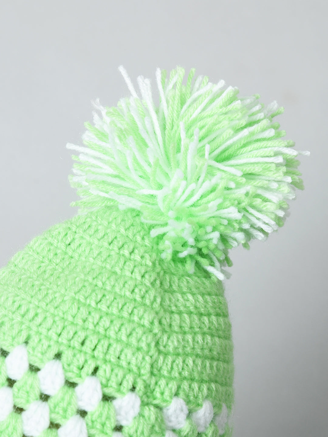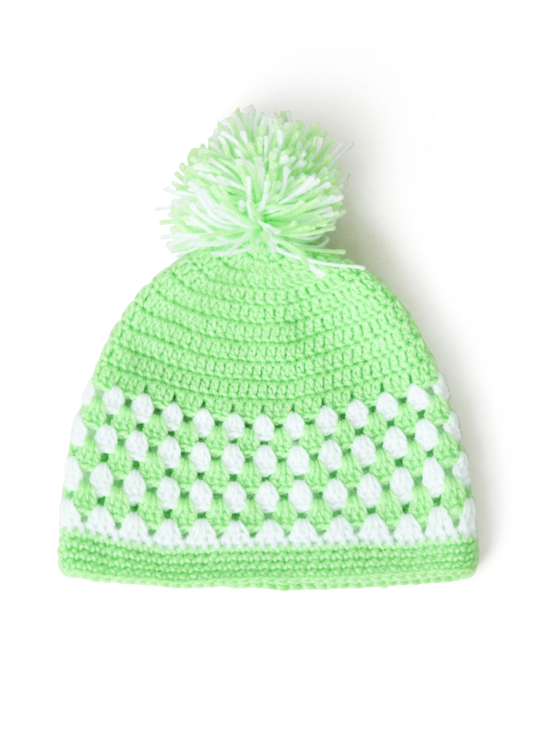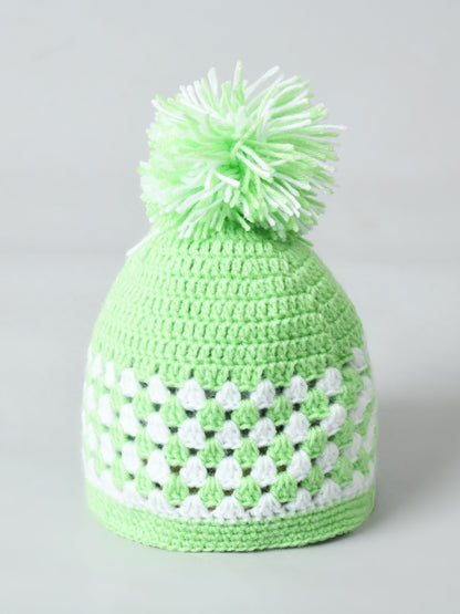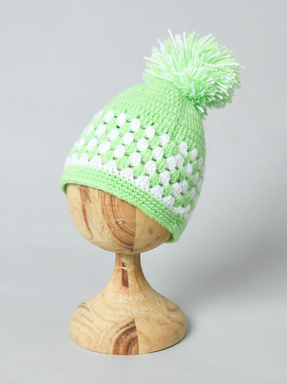 Green & White Handmade Woollen Pom Pom Cap for Kids