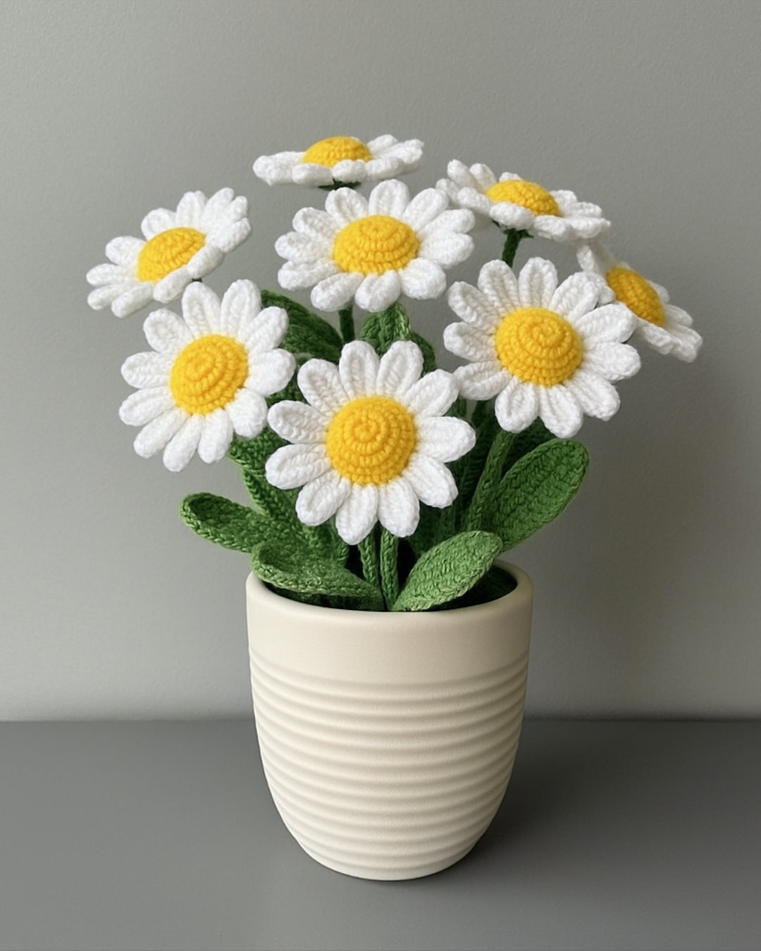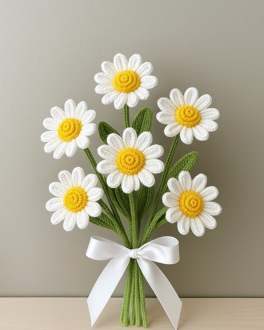 This handmade crochet daisy bouquet features delicate white petals with golden centers. A charming, long-lasting floral arrangement perfect for home décor, gifting, or special occasions.