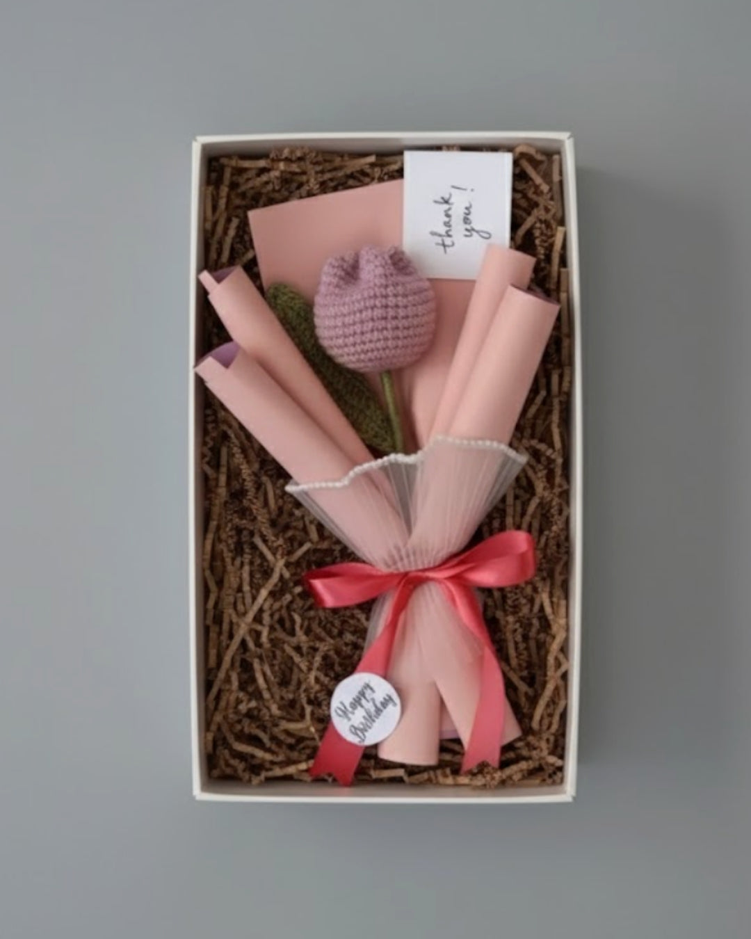 A soft and elegant handmade crochet mauve tulip bouquet featuring one beautifully crafted bloom. An everlasting floral accent for décor, gifting, or keepsake collections.