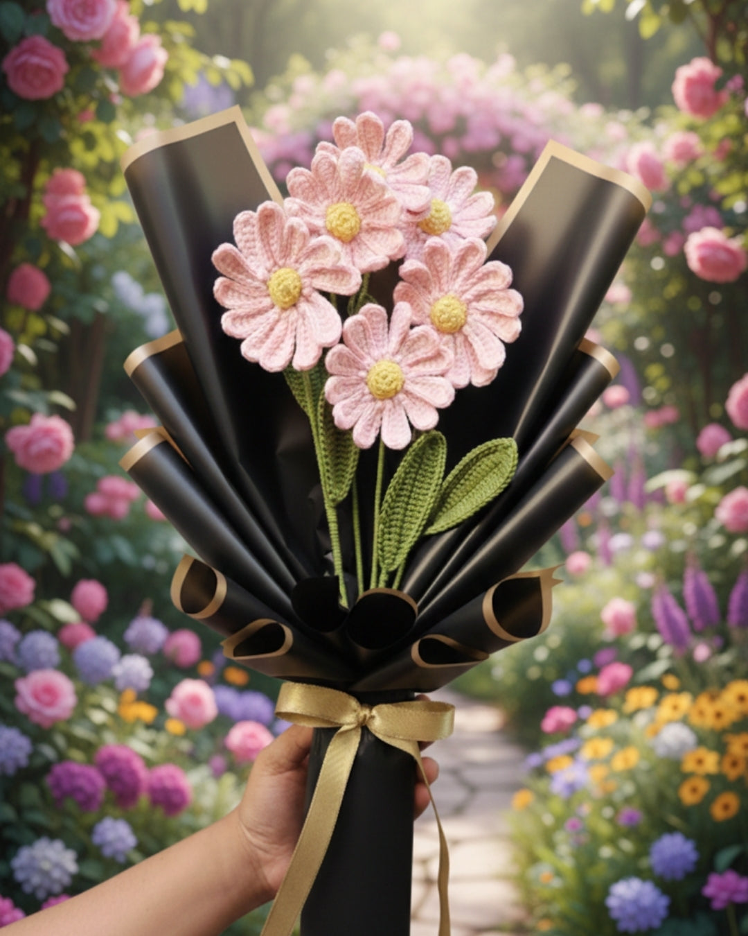 This Handmade Crochet Pink Daisy Flower Bouquet is a charming and everlasting floral arrangement, thoughtfully crafted to add a soft, elegant touch to any space. Each pink daisy flower is carefully hand-crocheted with fine-quality yarn, showcasing delicate detailing and neat finishing that reflects true handmade craftsmanship. Unlike real flowers, this crochet flower bouquet never wilts or fades, making it a long-lasting keepsake that can be cherished for years.