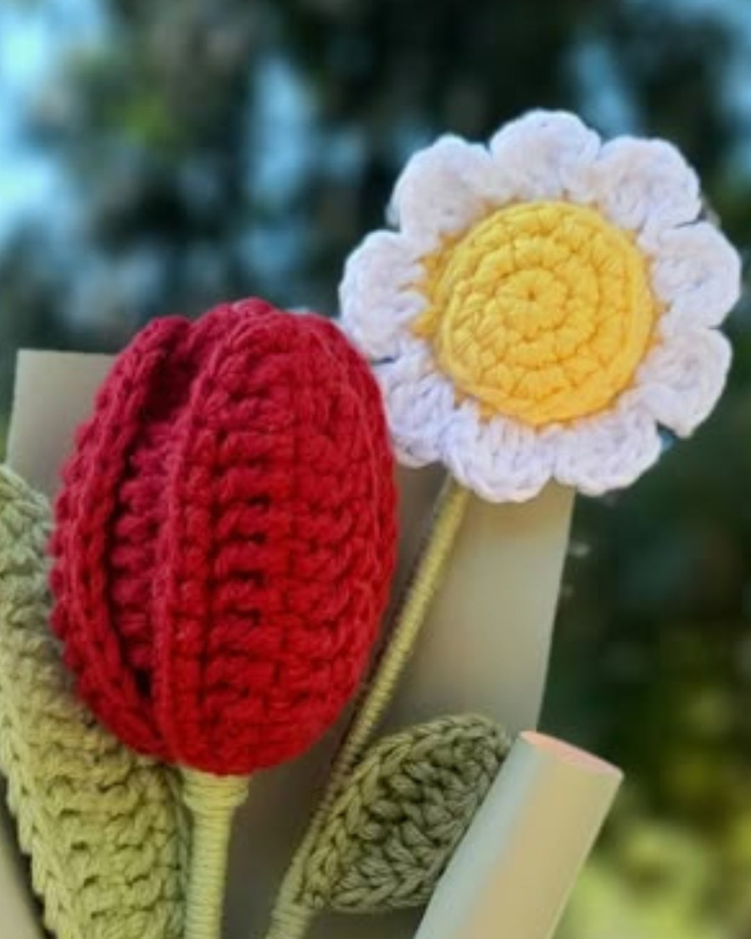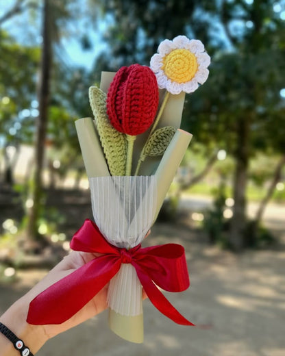 Handmade Crochet Red Tulip & Daisy Flower Bouquet