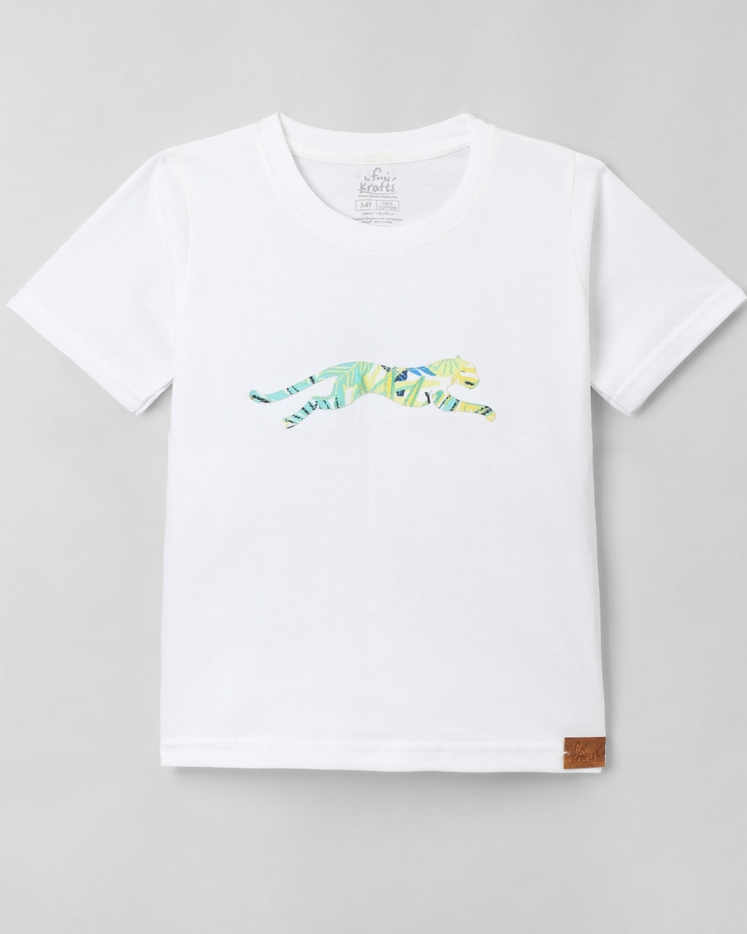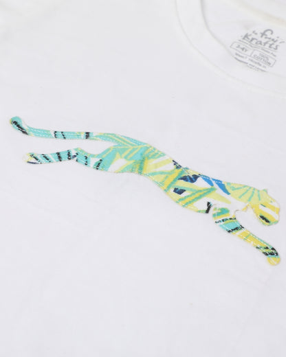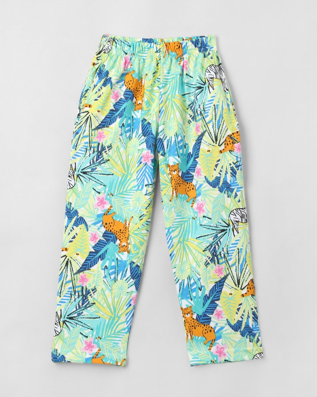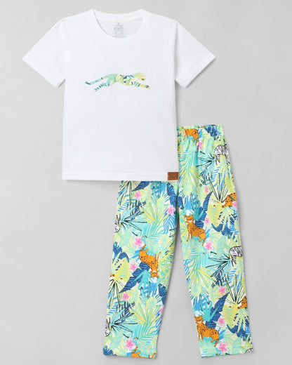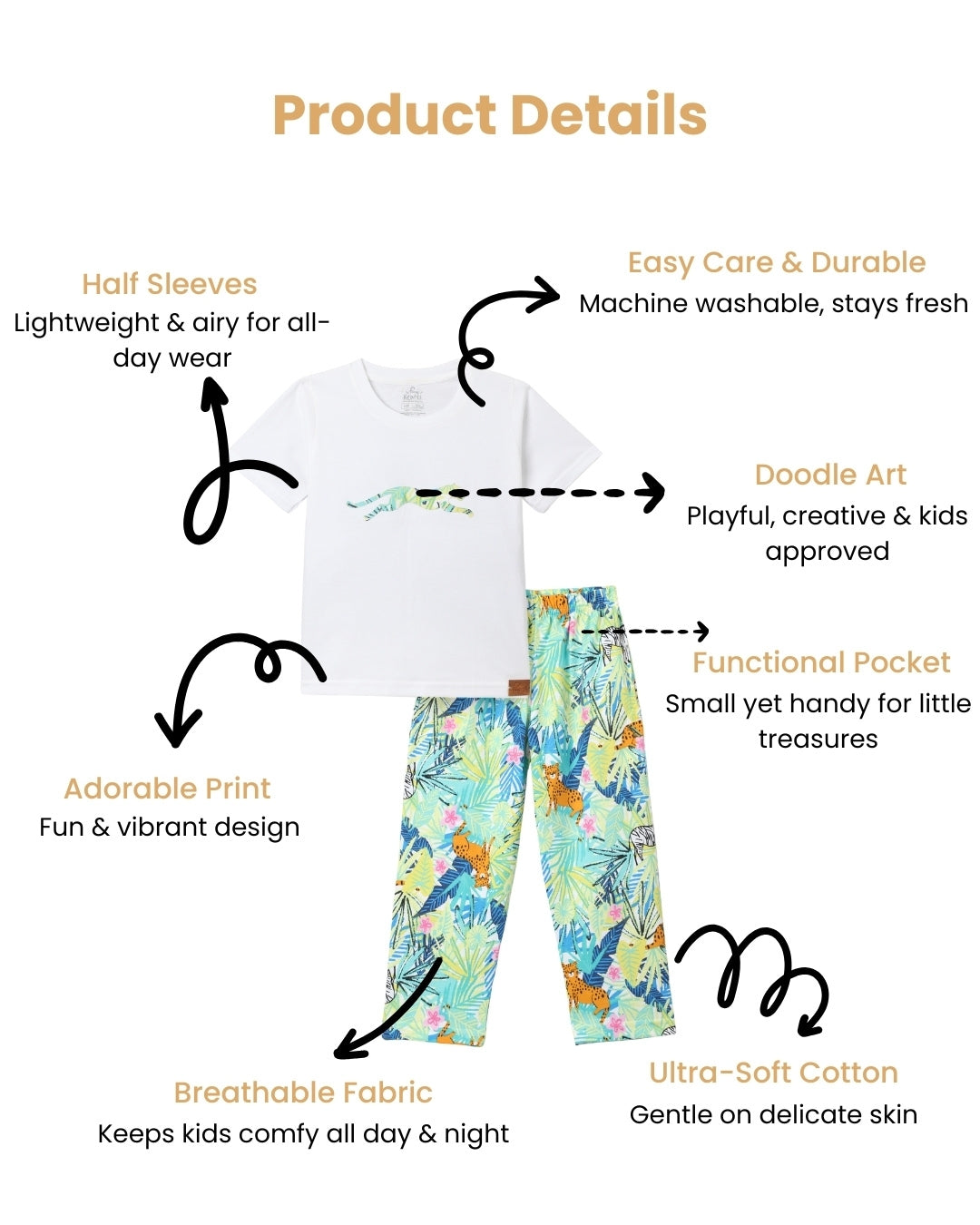 Jungle Printed Premium Cotton Half Sleeves White T-Shirt with Multicolor Pyjama for Girls