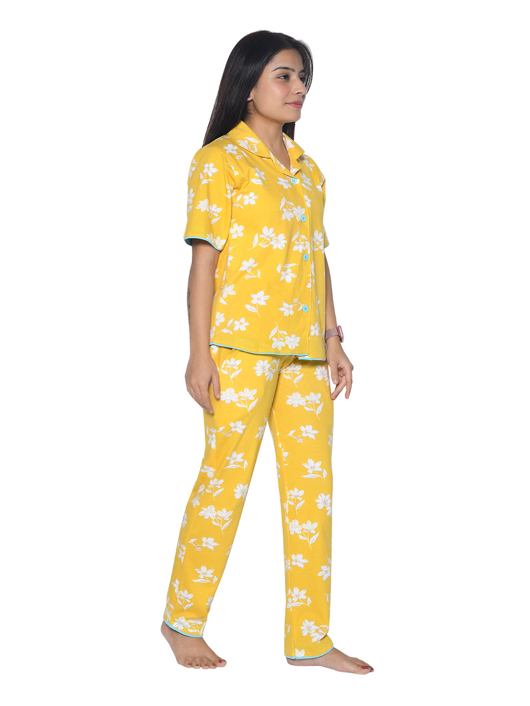 The mustard floral print on this night suit is beautiful. The cotton is soft and comfortable, making it perfect for my daughter’s loungewear collection.