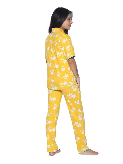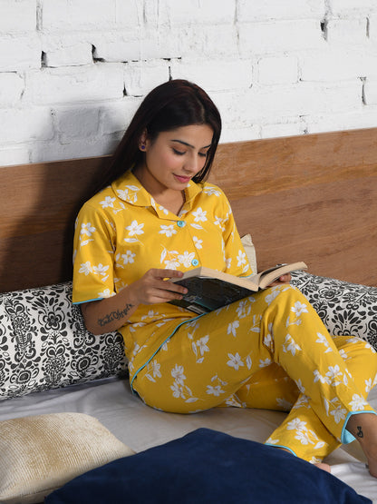 Style and satisfaction is a guarantee with girls mustard floral printed night suit by Funkrafts. Made with 100% pure cotton and a buttoned opening, this is a perfect addition to your summer wardrobe.