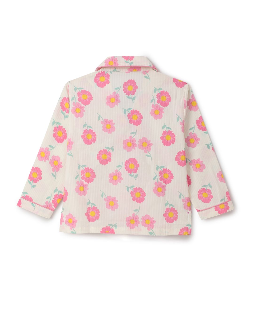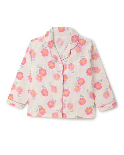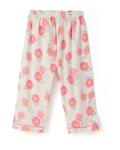Off White & Pink Premium Cotton Full Sleeves Floral Printed Collar Style Nightsuit for Girls