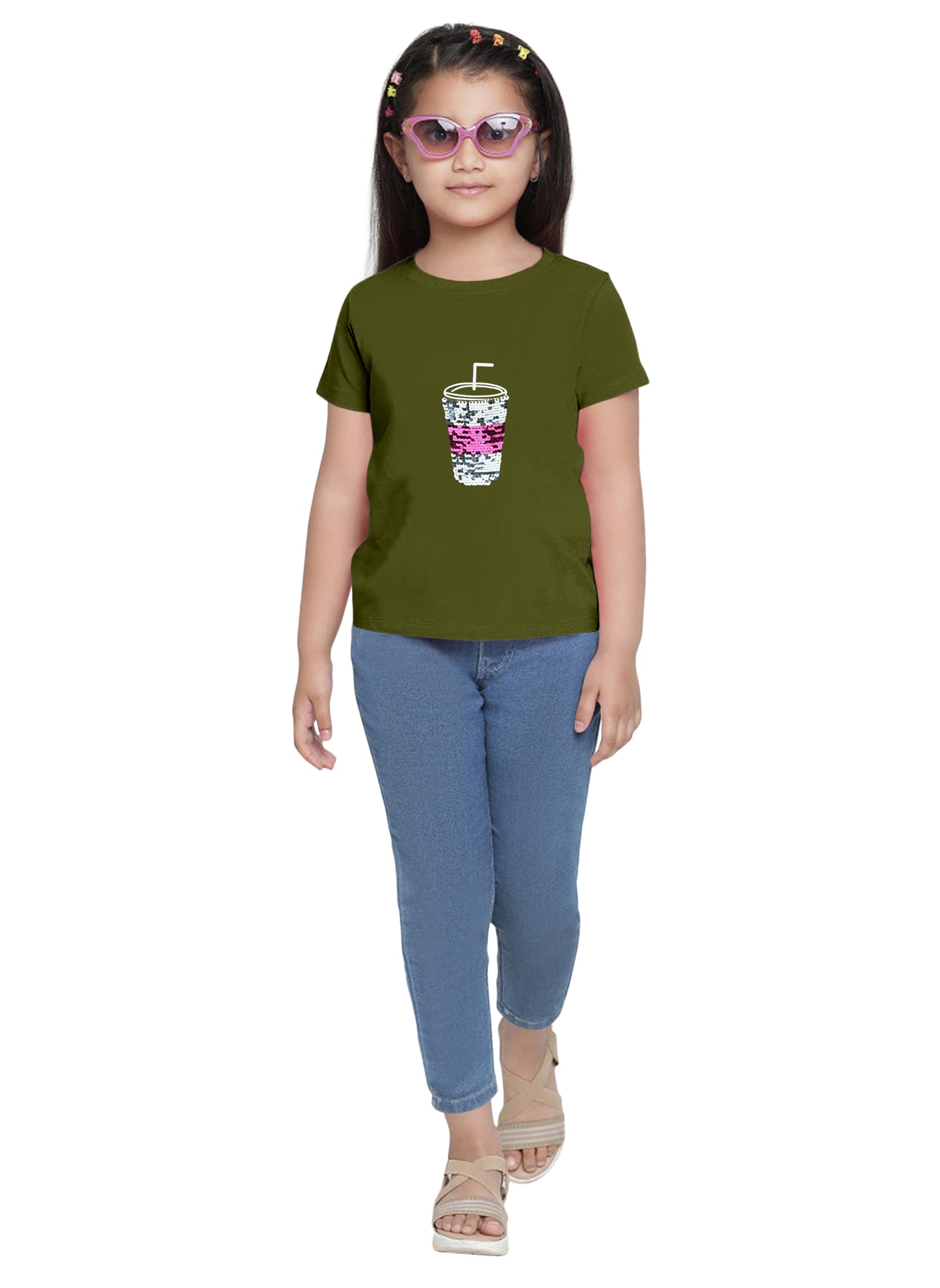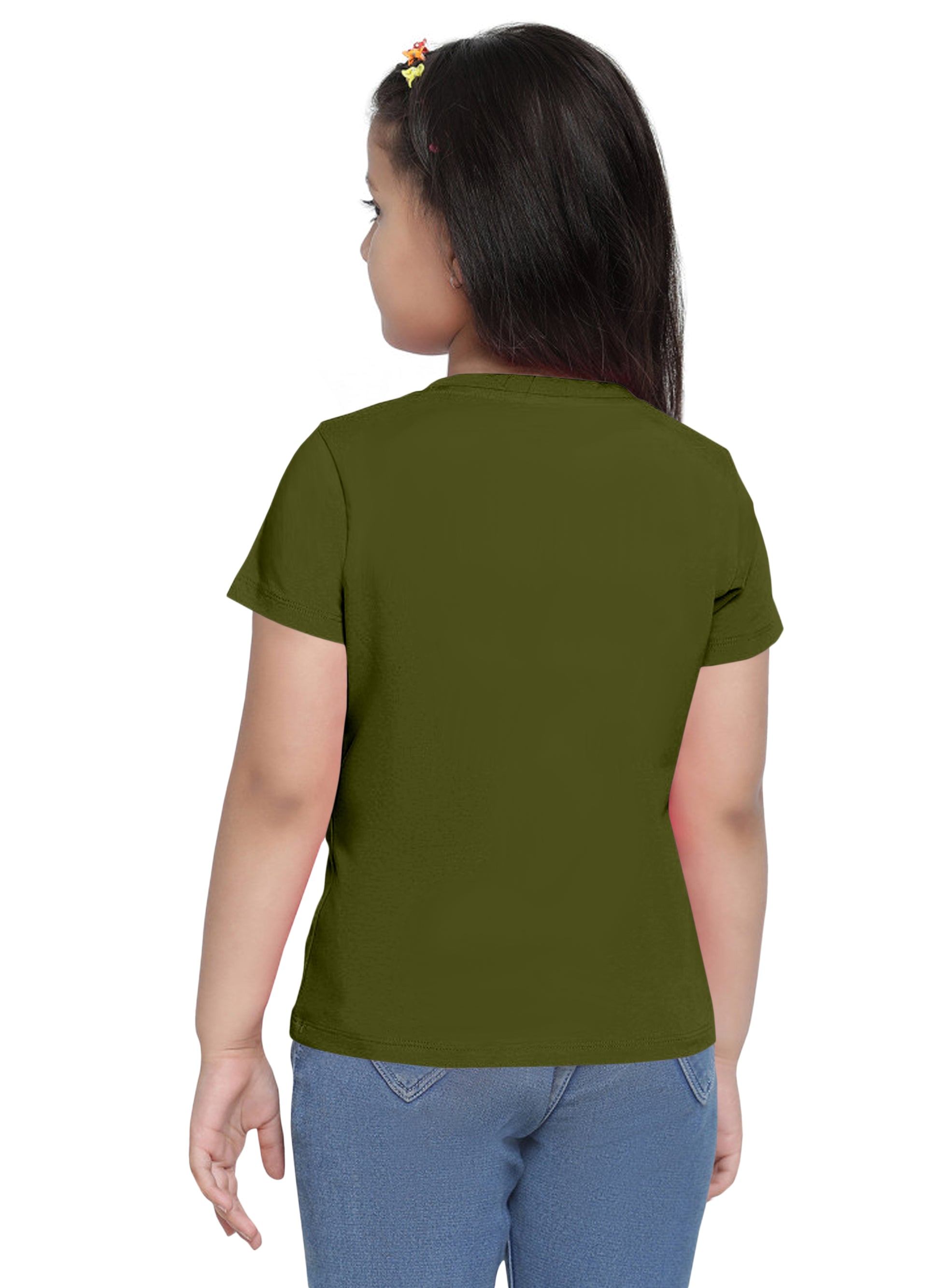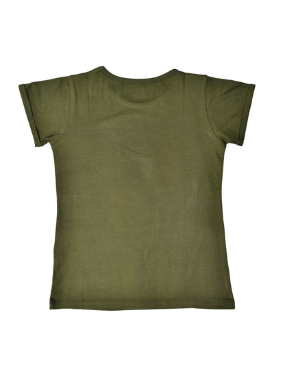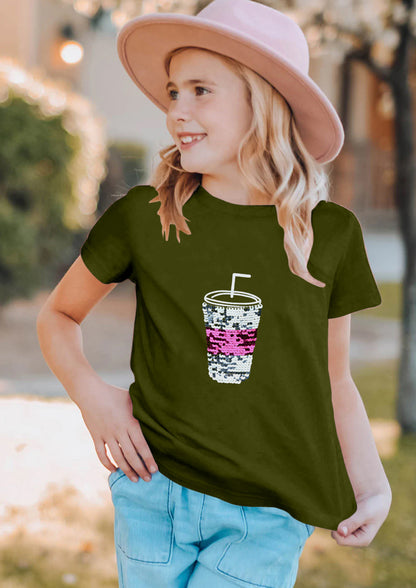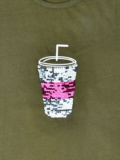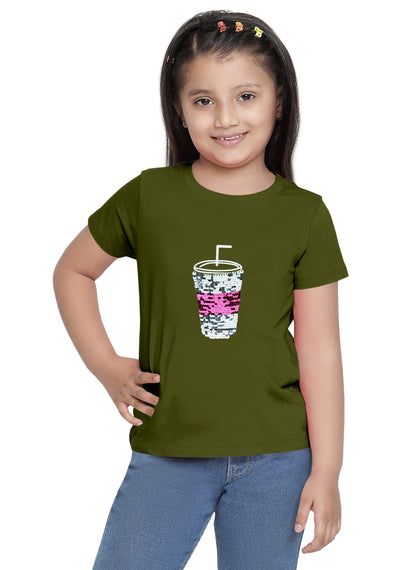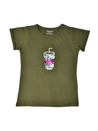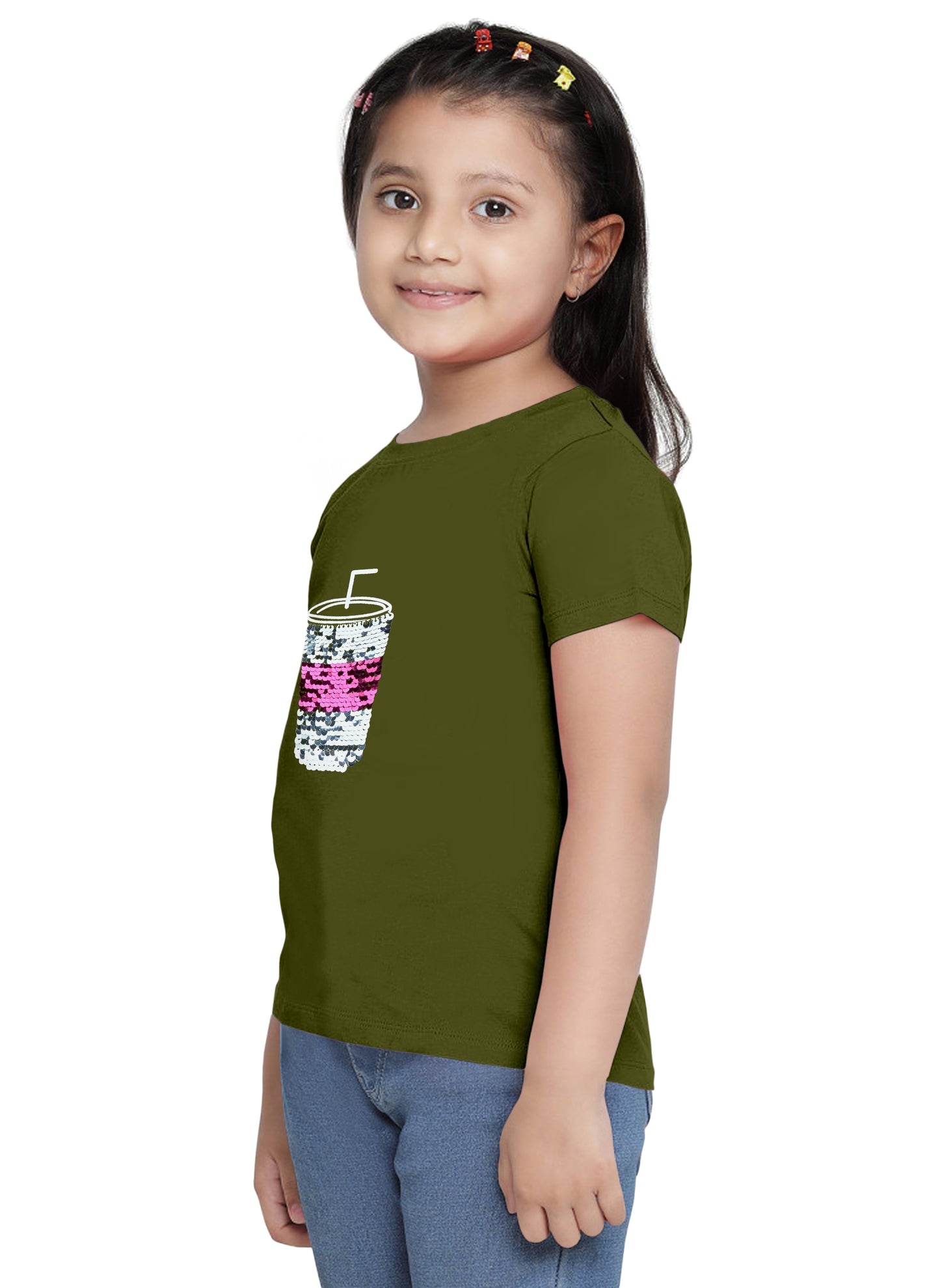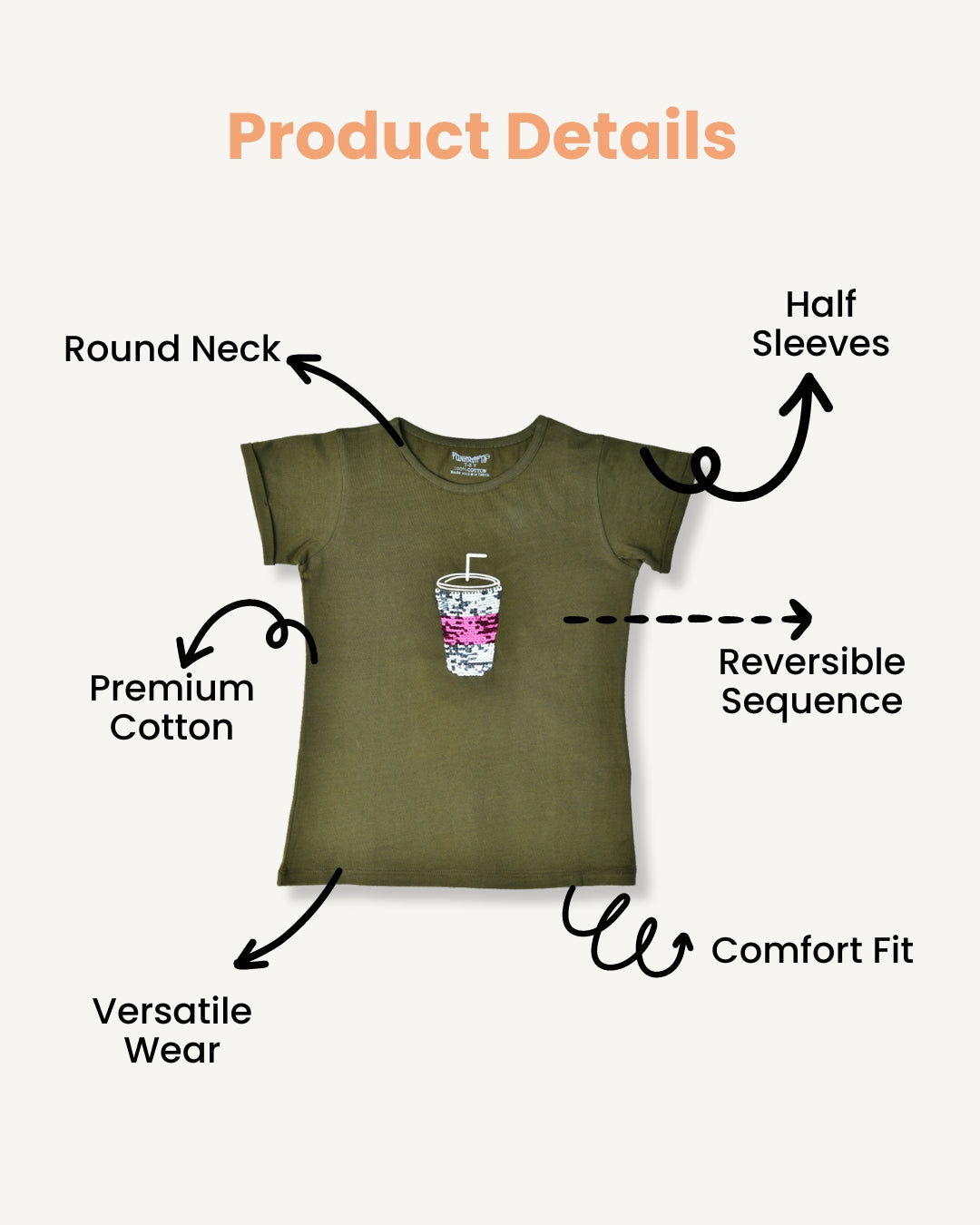 Perfect for any occasion from evening to casual wear, she'll be sure to stand out in this girls olive green flip sequin pure cotton T-shirt by Funkrafts. It has a round neck and short sleeves.