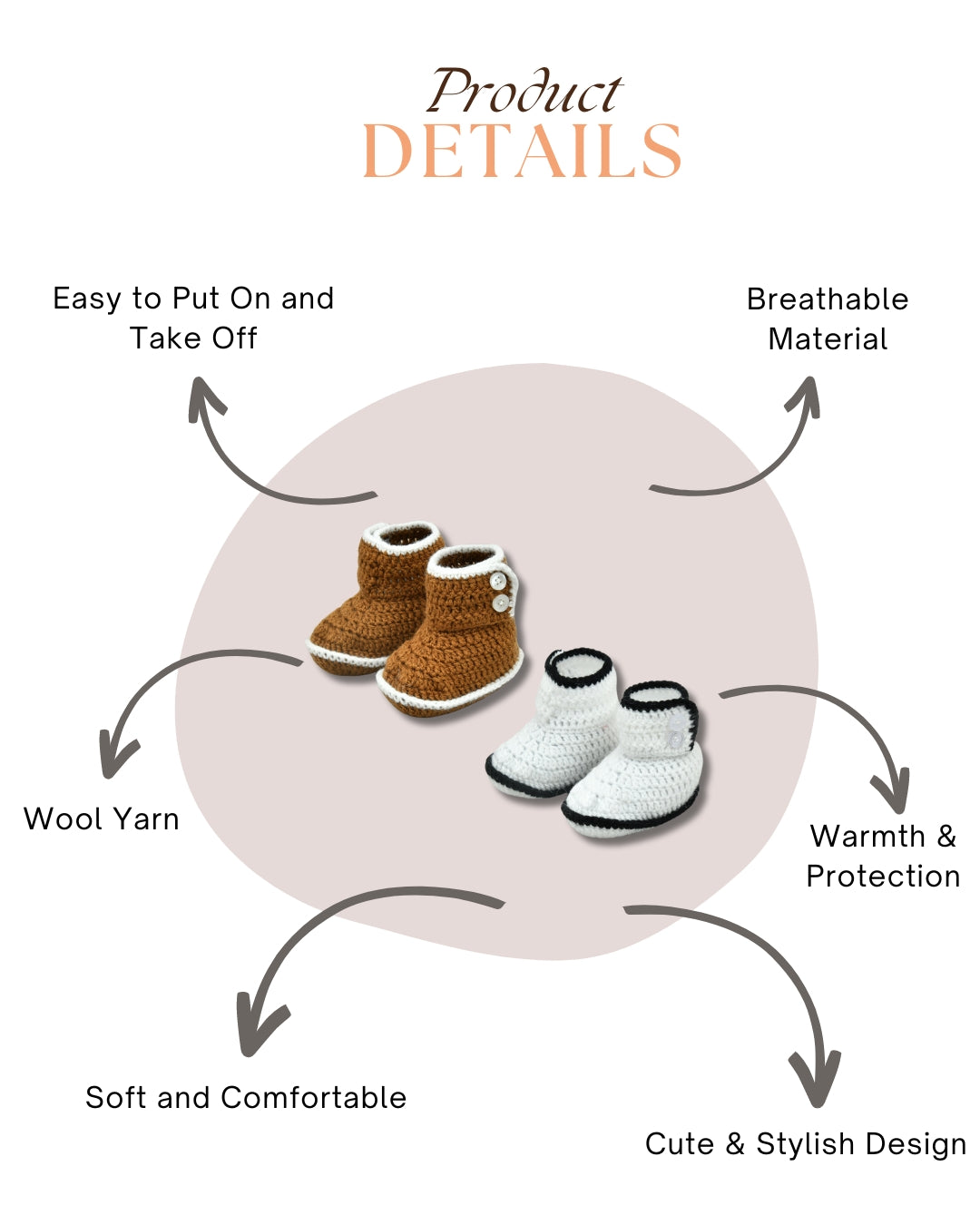 Elevate your baby girl’s wardrobe with our Handmade Crochet Baby Booties Pack of 2 in Brown and White. Crafted from cozy acrylic wool, these booties offer a snug fit and easy slip-on design.
