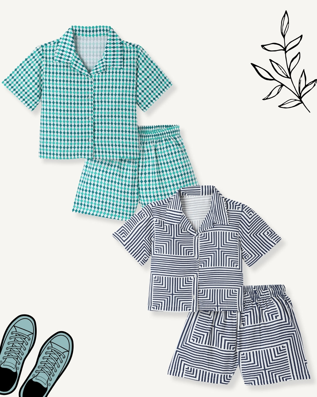 Pack of 2 - Premium Cotton Half Sleeves Printed Collar Style T-Shirt & Shorts Set for Girls - Navy Blue & Green