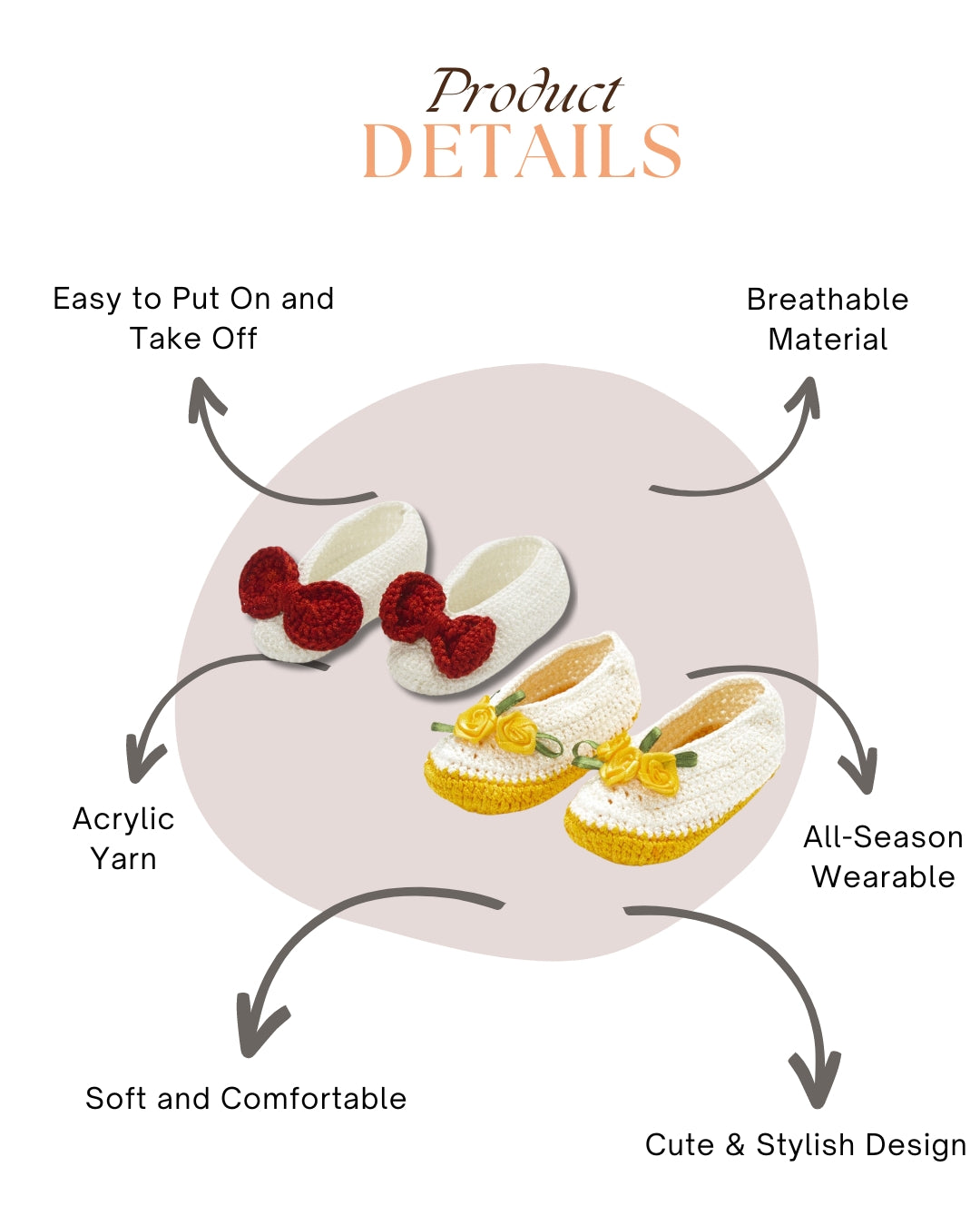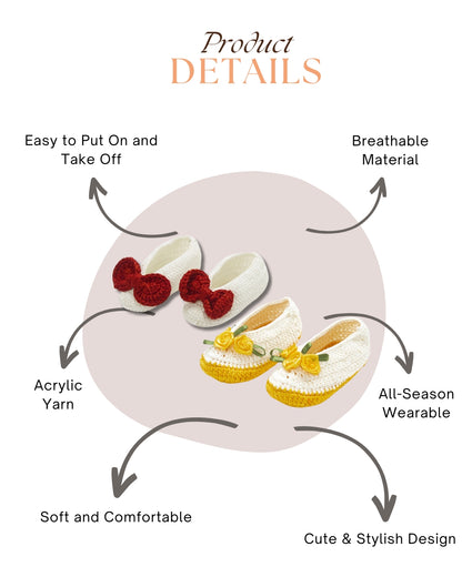 Introduce charm with our Pack of 2 Handmade Crochet Baby Booties in White & Yellow. Made from soft, breathable acrylic yarn for all-season wear, these booties offer style, flexibility, and safety.