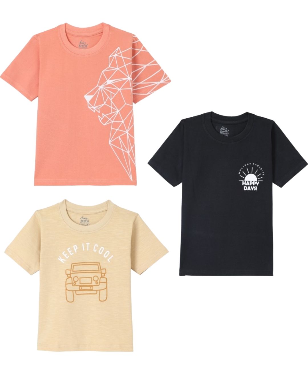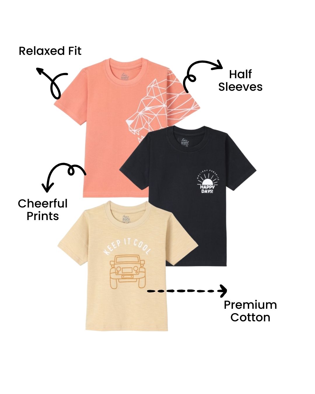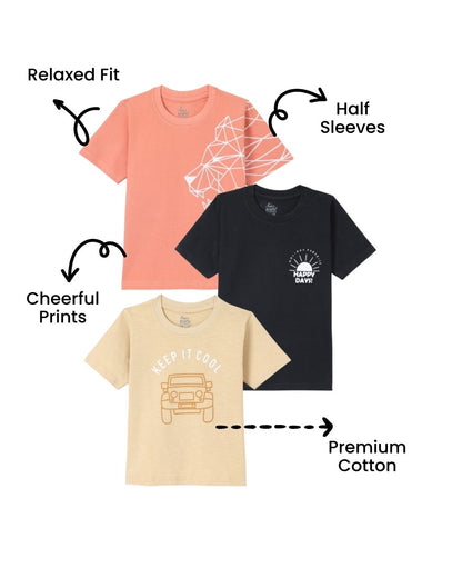 Pack of 3 Premium Cotton Half Sleeves Printed T-Shirt for Boys - Beige, Black & Peach