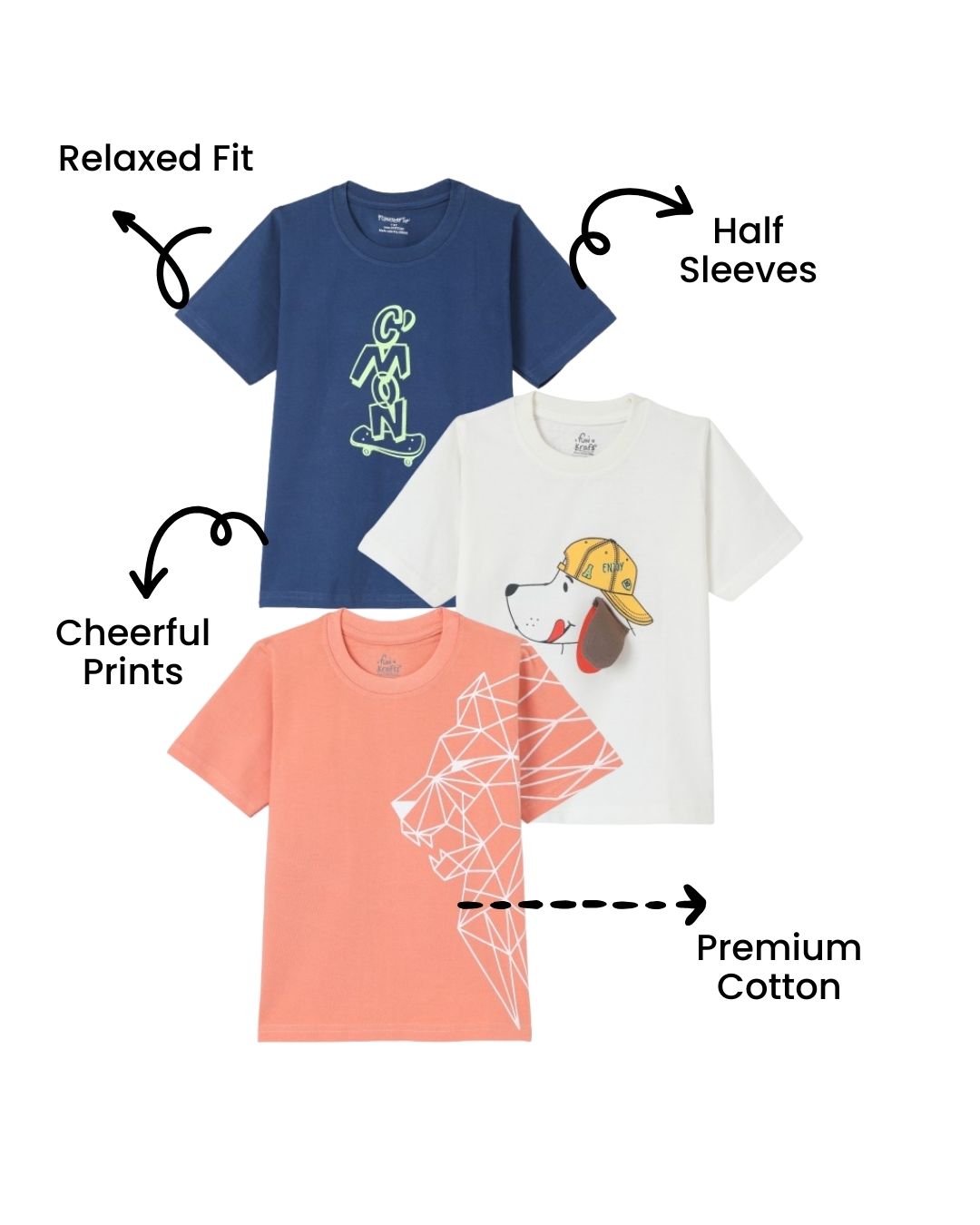 Add a splash of color to your boy’s wardrobe with Funkrafts Boys Premium Cotton Half Sleeves Pack of 3 Printed T-Shirts in peach, blue, and white. These t-shirts for boys are made from premium cotton, offering a soft and breathable fabric that keeps your child comfortable throughout the day. Ideal for both casual outings and active play, these boys t-shirts are designed to provide a perfect balance of style and comfort. Each t-shirt for boys features fun and trendy prints, making them a fashionable choice for any occasion. These boys t-shirts are easy to pair with a variety of bottoms, such as jeans, shorts, or joggers, for a versatile and stylish look. The high-quality cotton ensures that these t-shirts for boys are durable and retain their softness after multiple washes. Let your little one stay comfortable and stylish with these boys t-shirts, perfect for any occasion, from playdates to family outings.