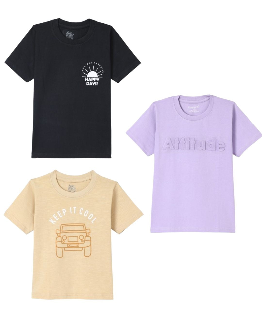 For a bold and trendy look, choose Funkrafts Boys Premium Cotton Half Sleeves Pack of 3 Printed T-Shirts in beige, black, and purple. These t-shirts for boys are made from premium cotton, offering maximum comfort and breathability. Whether for a casual day at home, a fun playdate, or a family outing, these boys t-shirts are perfect for any occasion. Each t-shirt for boys in this set features unique prints that make your child’s outfit stand out. Designed for a comfortable fit, these boys t-shirts allow freedom of movement and are soft on the skin, ensuring your child feels great all day. The bright colors and fun designs make these t-shirts for boys a versatile addition to any wardrobe. Pair them with shorts, joggers, or jeans for a complete look. These boys t-shirts are also durable and retain their quality after multiple washes, making them a long-lasting and stylish choice for your child’s everyday wear.
