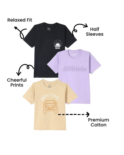 Pack of 3 Printed Premium Cotton Half Sleeves T-Shirt for Boys - Beige, Black & Purple