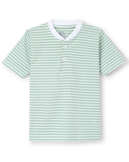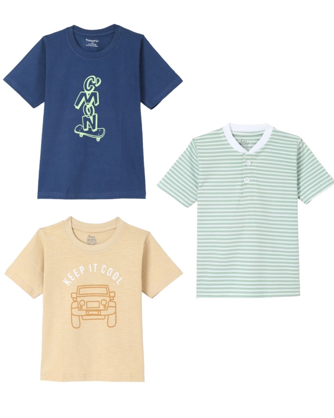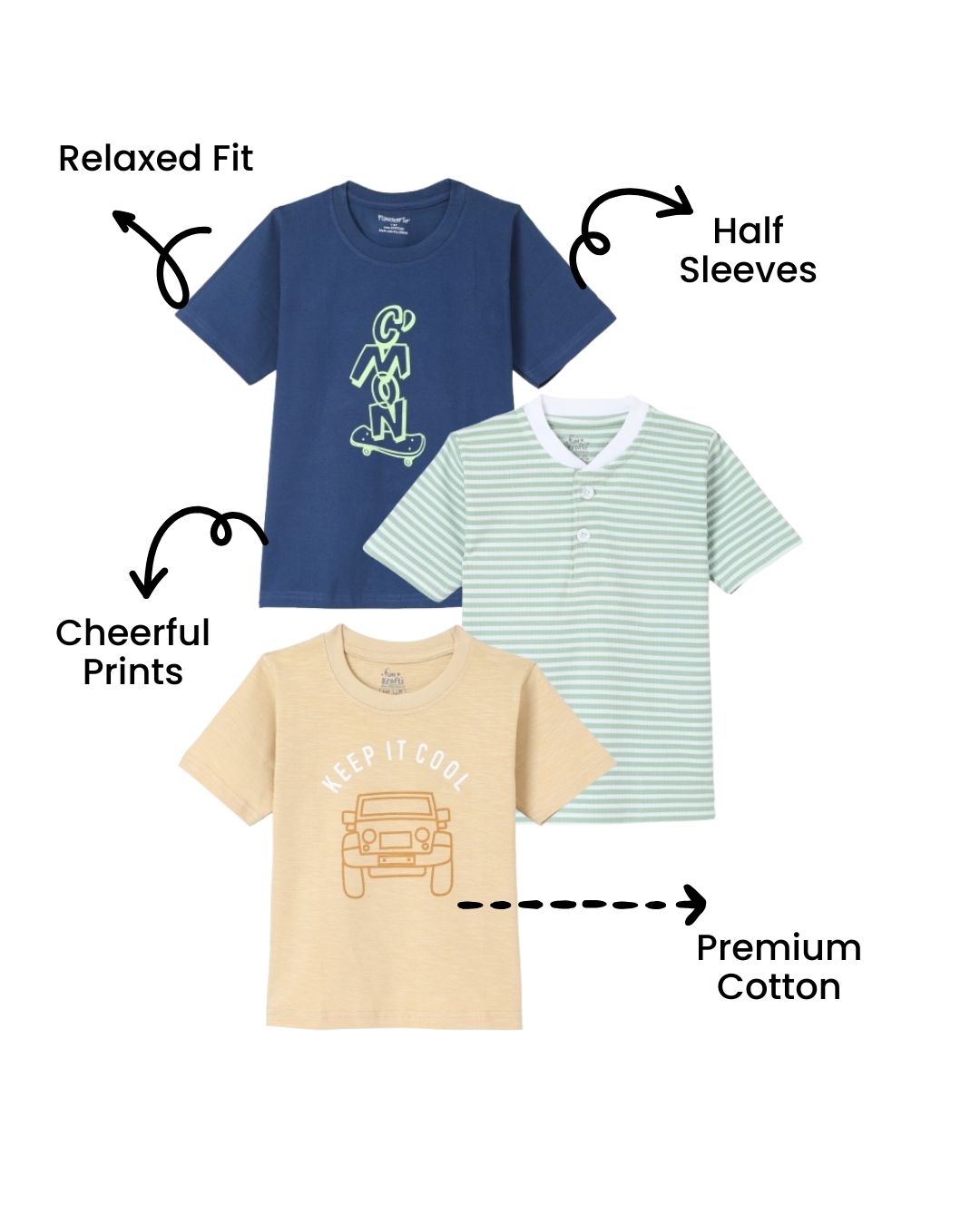 Pack of 3 Printed Premium Cotton Half Sleeves T-Shirt for Boys - Beige, Blue & Green