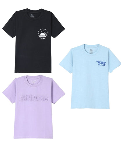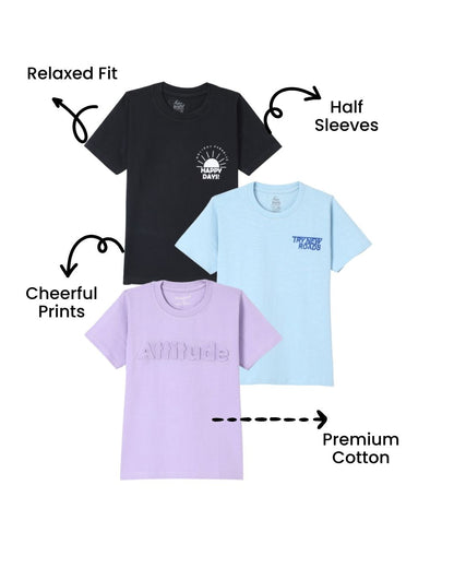Pack of 3 Printed Premium Cotton Half Sleeves T-Shirt for Boys - Black, Purple & Brown