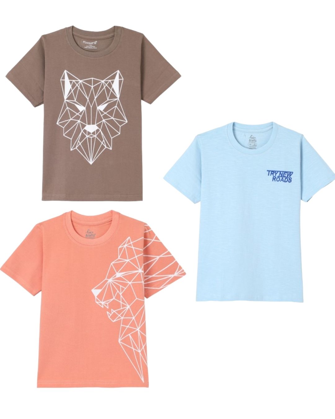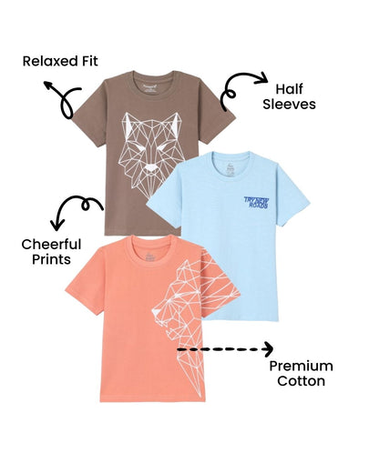 Pack of 3 Printed Premium Cotton Half Sleeves T-Shirt for Boys - Peach, Blue & Brown