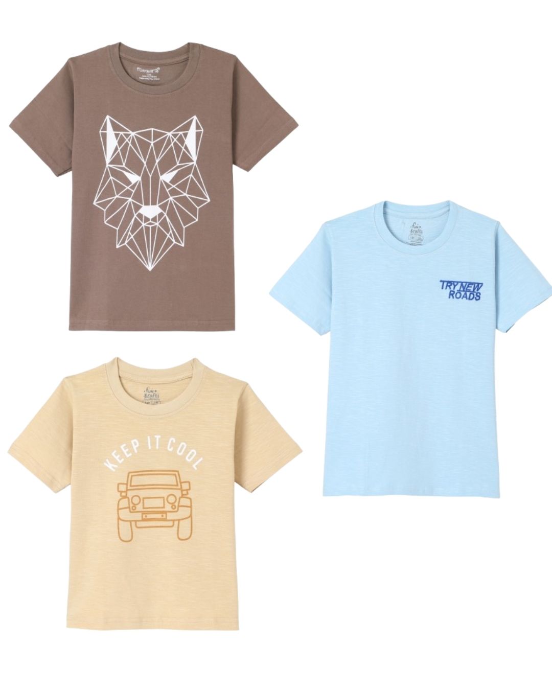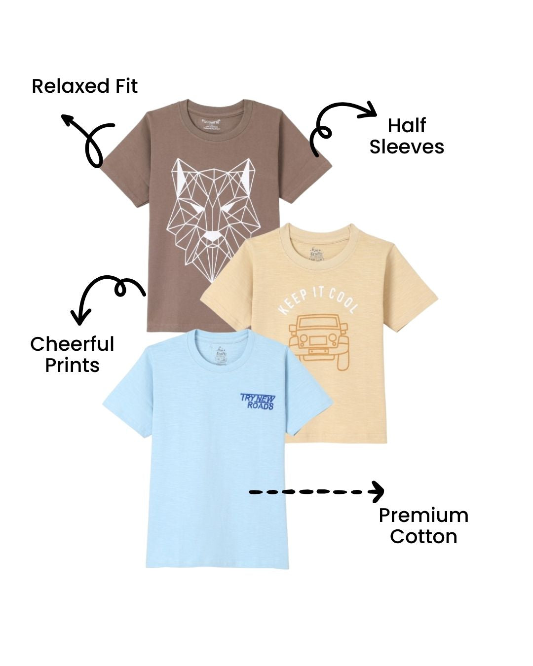 Pack of 3 Printed Premium Cotton Half Sleeves T-Shirt for Boys - Beige, Blue & Brown
