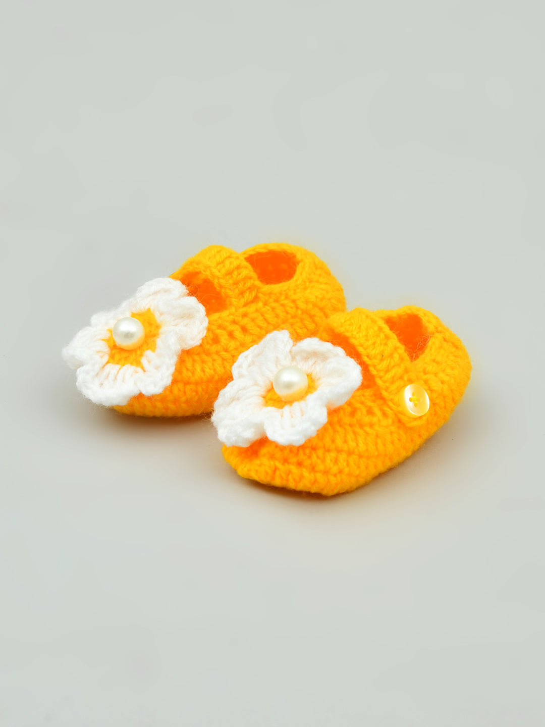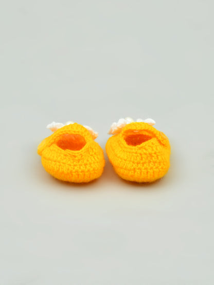 Dress up your baby in the cutest way with these yellow & white flowered crochet baby booties for girls from Funkrafts. Handcrafted from high-quality wool.