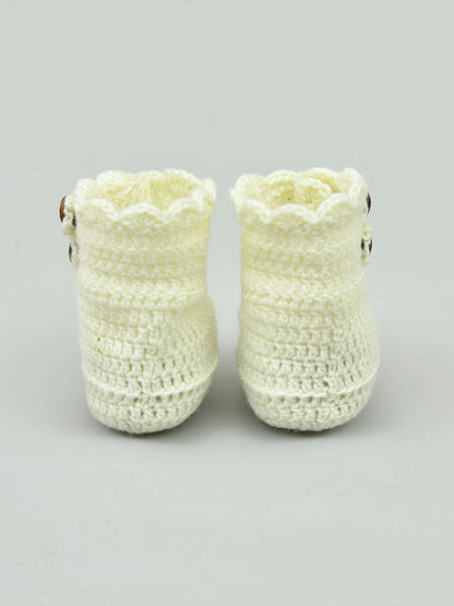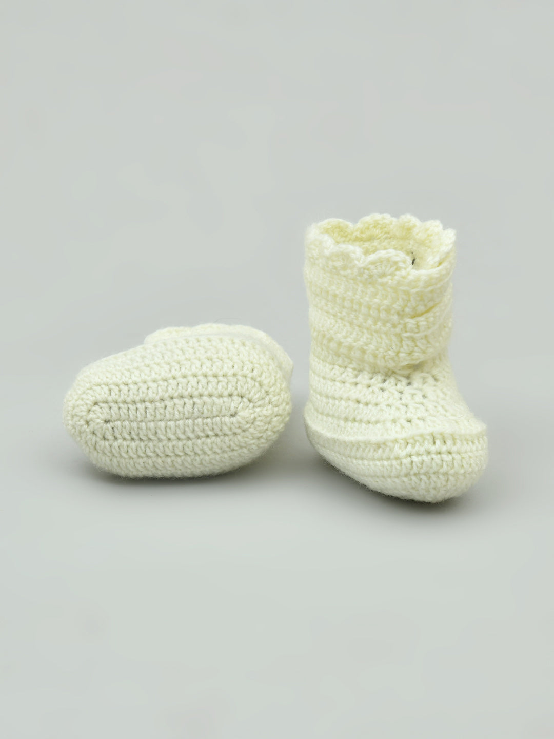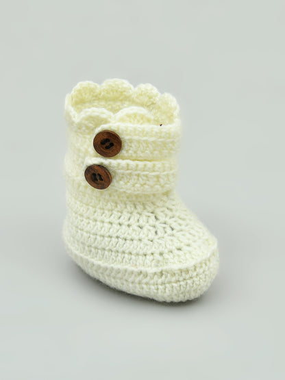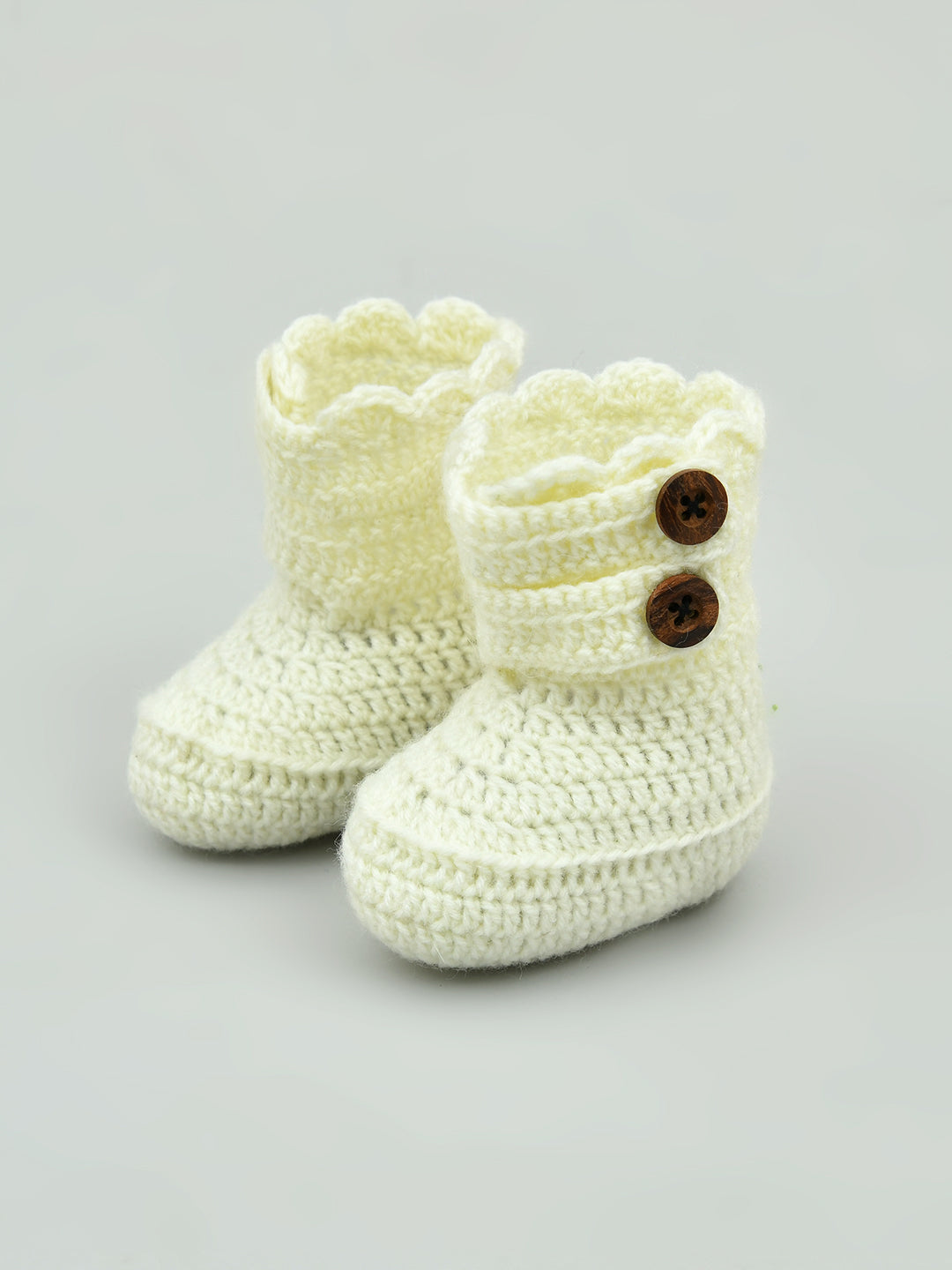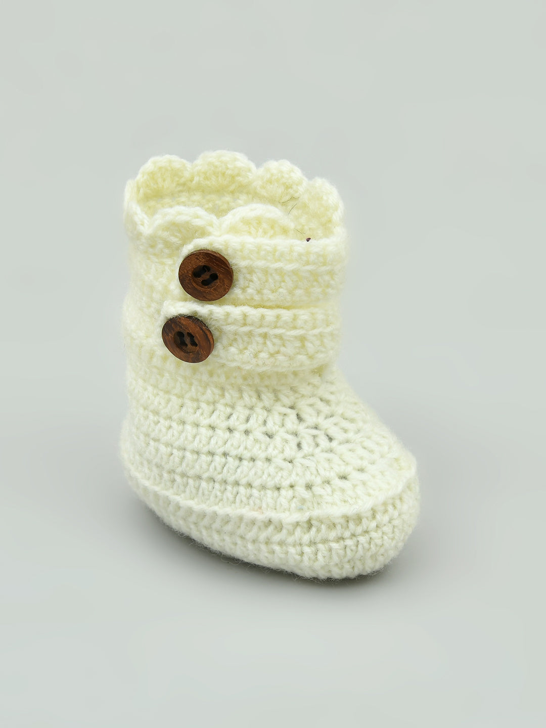 Cozy up your baby's feet with these handmade off white woollen baby booties. It makes a great gift for any expecting mother's baby shower.