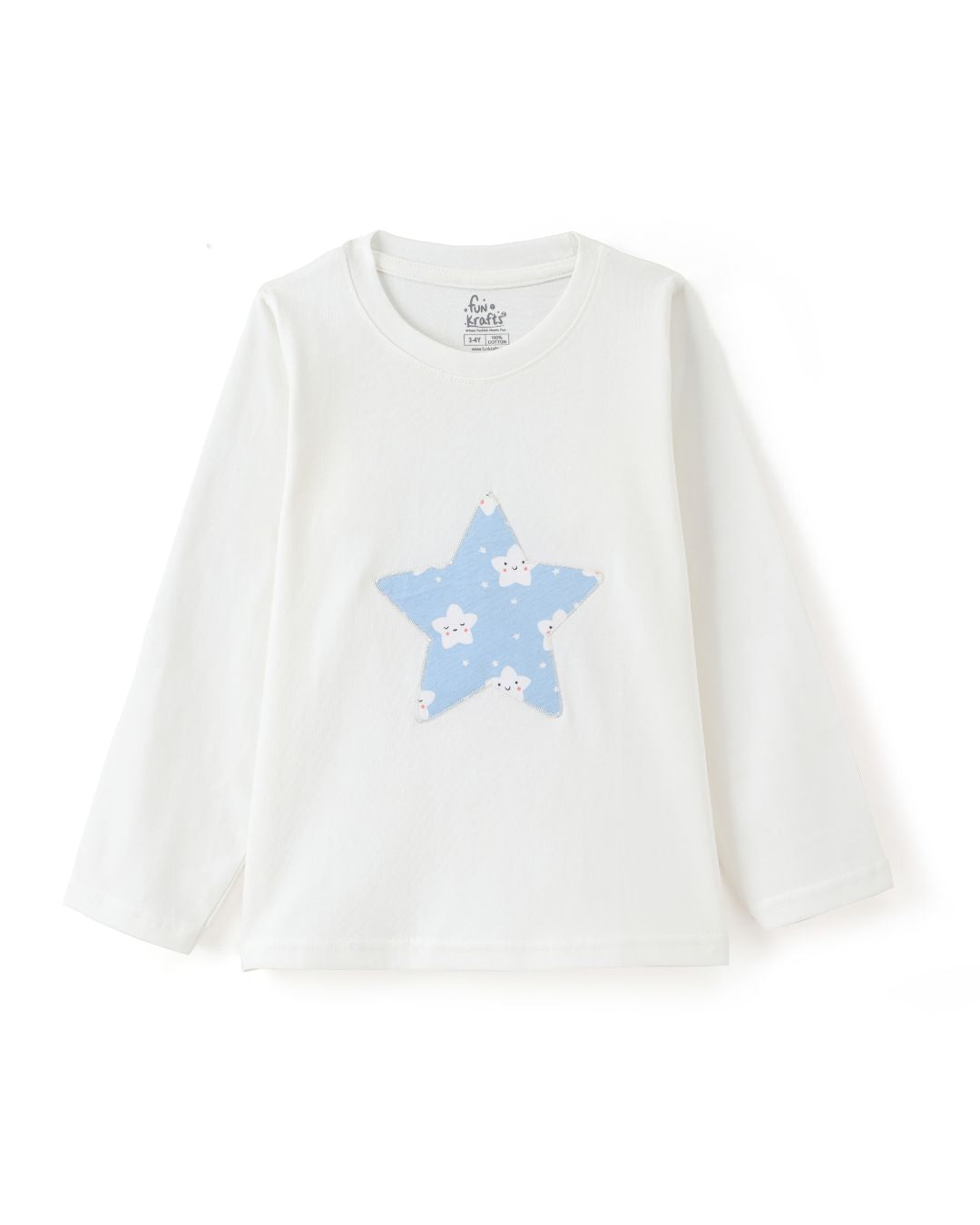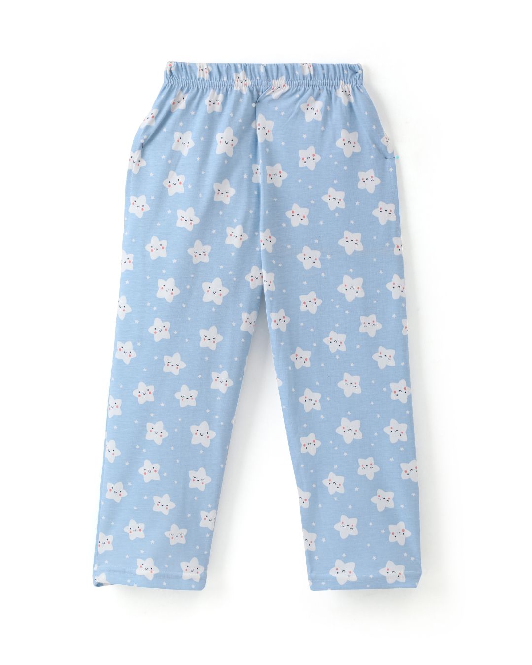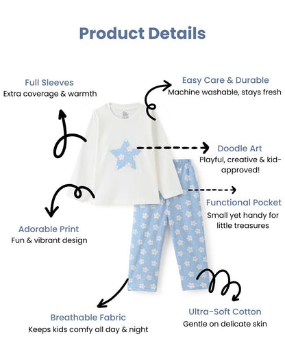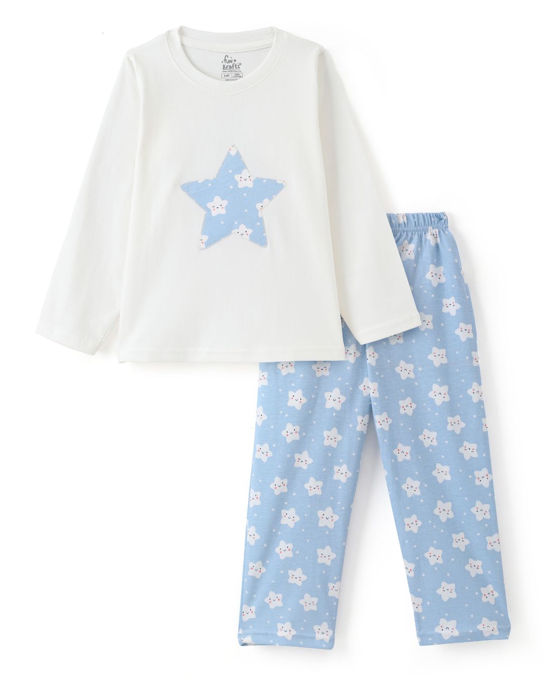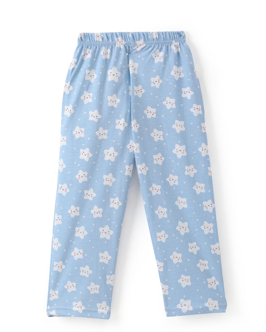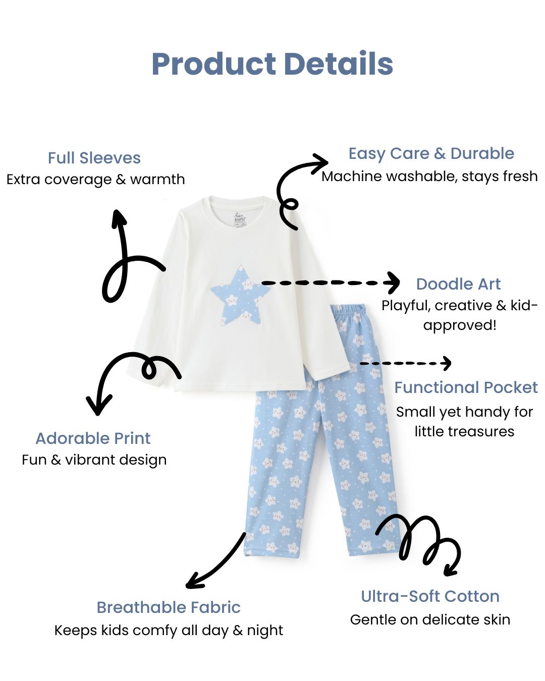 Star Printed Premium Cotton Full Sleeves White T-Shirt with Blue Pyjama for Boys & Girls