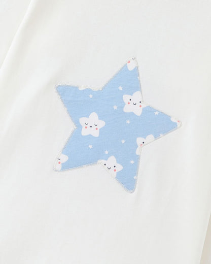 Shine bright with this star-printed premium cotton full sleeves white t-shirt and blue pyjama clothing set for boys and girls. This loungewear is designed to combine comfort, style, and practicality. The adorable star applique adds a touch of charm, making it a delightful choice for kids. Made from high-quality cotton, this outfit ensures your little ones stay comfortable during playtime, bedtime, or casual lounging. The full sleeves add an extra layer of coziness, making it suitable as both loungewear and nightwear for boys and girls. The soft blue pyjama perfectly complements the white t-shirt, creating a coordinated and stylish look. Whether it's a quiet evening at home or a fun sleepover, this clothing set is the go-to choice for kids who love to stay comfortable yet fashionable.