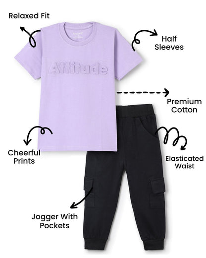 Typographic Printed Premium Cotton Half Sleeves Purple T-Shirt with Black Jogger for Boys