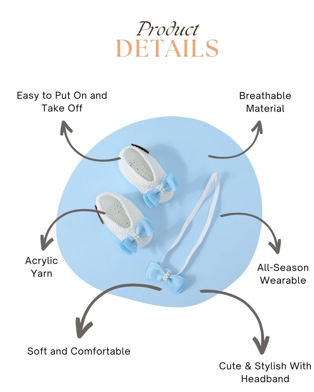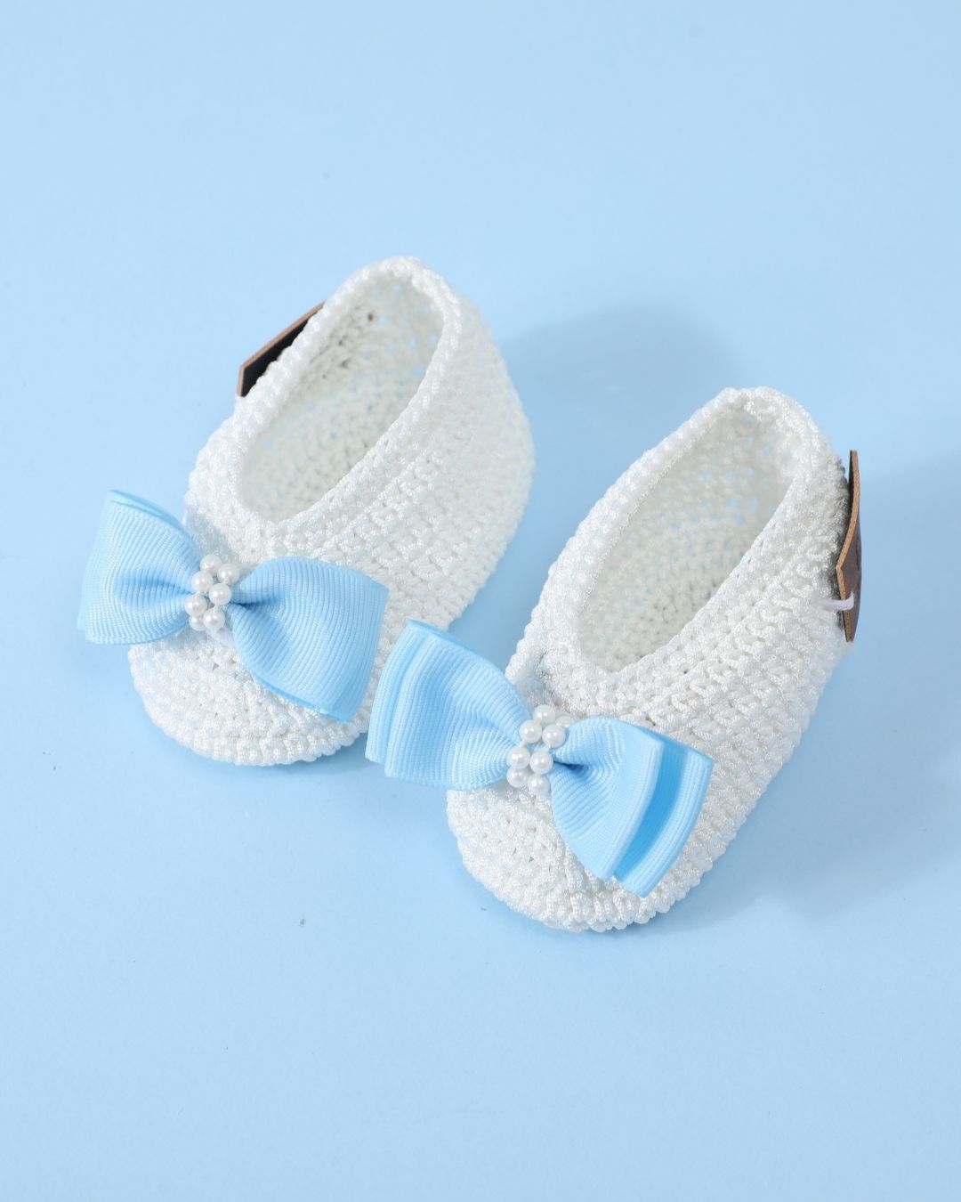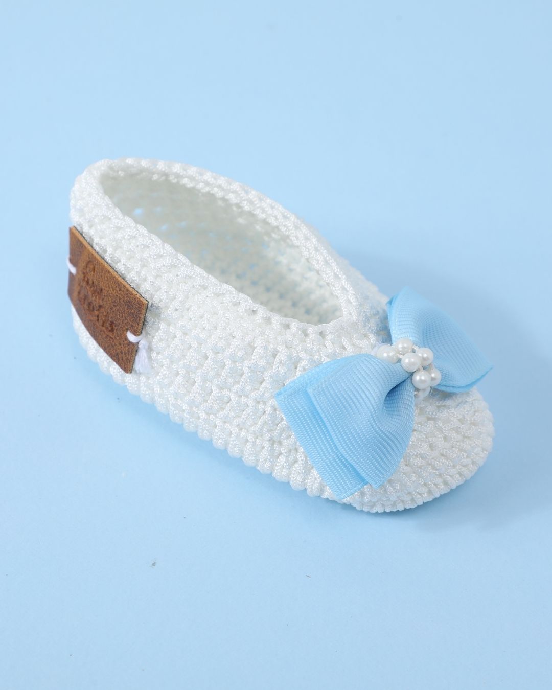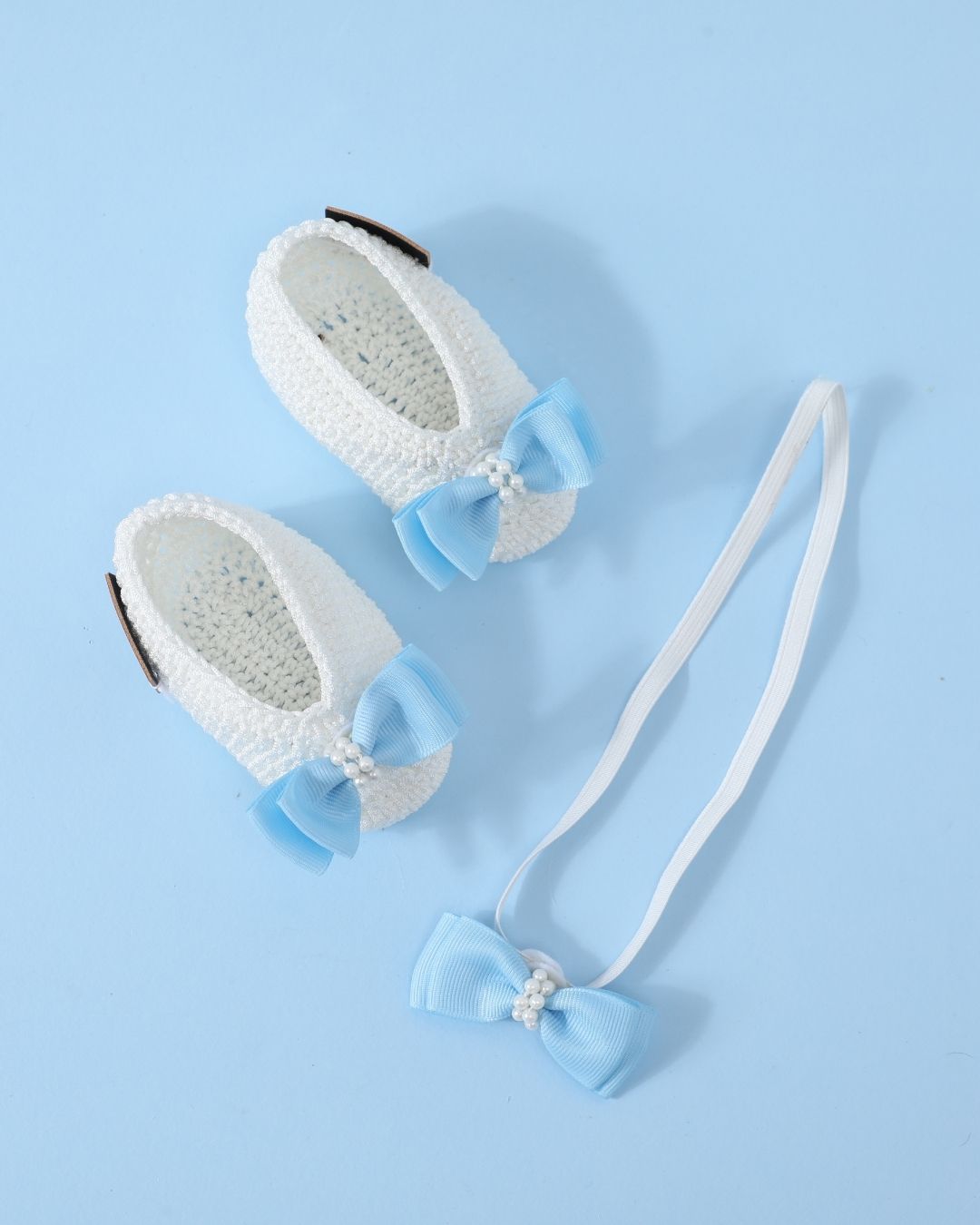 Elevate your baby’s style with this white and blue handmade crochet baby booties and headband set. Made from premium acrylic wool, these baby booties and matching headband are perfect for infants aged 6-12 months and suitable for all seasons. The classic white base paired with soft blue accents creates a sophisticated and versatile design, making these booties for baby girls a standout choice. Lightweight, breathable, and comfortable, this set is perfect for any occasion.