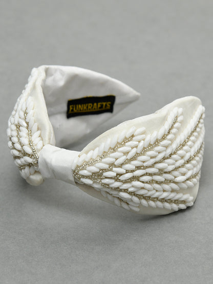 White Free Size Beaded Embroidered Hair Band