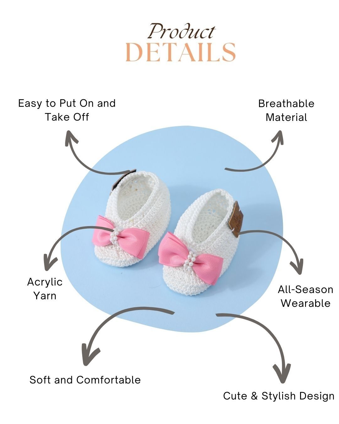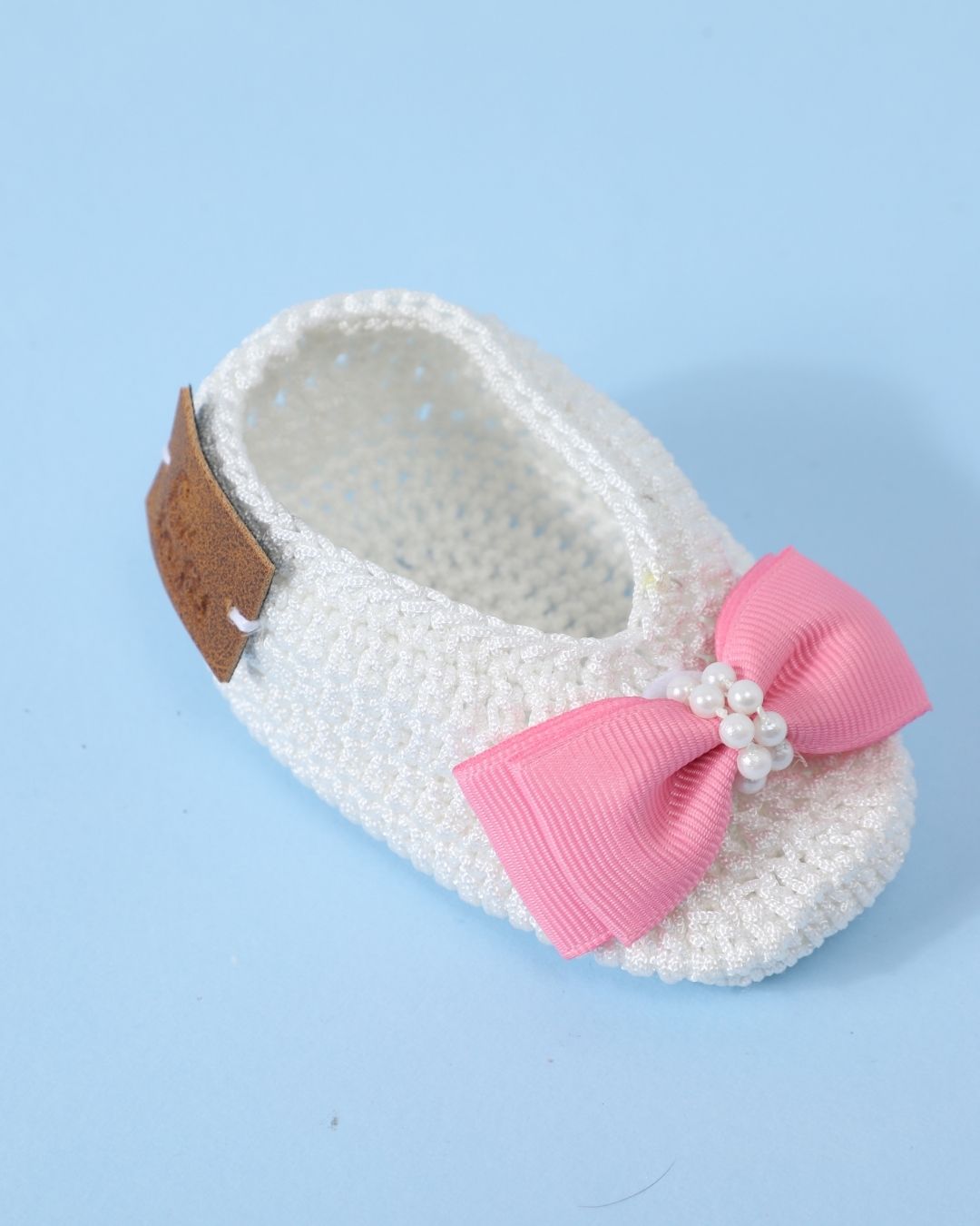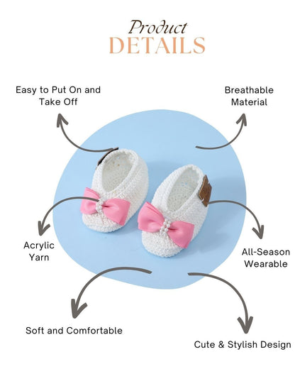 Delight in the charm of these white and pink handmade crochet baby booties for your little one. Made from soft acrylic wool, these baby booties ensure all-season comfort for infants aged 6-12 months. The sweet pink detailing on the classic white design adds a playful and elegant touch, making these booties for baby girls a delightful addition to any outfit. Lightweight, breathable, and easy to put on, these baby booties are both practical and adorable, offering maximum comfort and style.