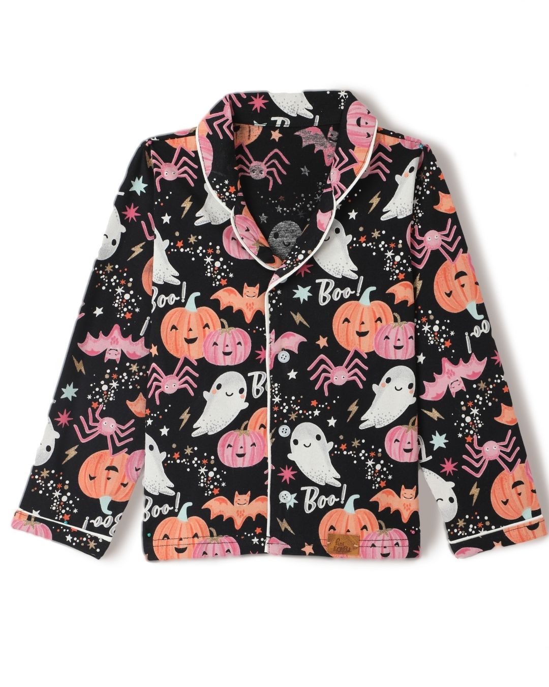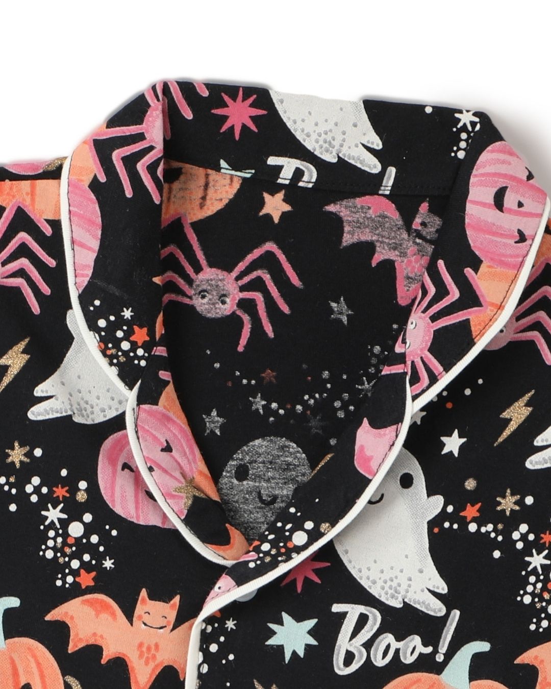 Get ready for spooky bedtime fun with this black Halloween-themed T-shirt and pyjama set, perfect for boys and girls. Crafted from soft, breathable cotton, this set ensures a cozy and comfortable fit while keeping the fun alive with its playful Halloween prints. The full-sleeve T-shirt features a whimsical Halloween-themed design, while the matching pyjamas complete the set with their relaxed fit. Whether your little one is lounging at home or getting ready for a night of sweet dreams, this co-ord set brings both comfort and style to the mix. The all-black color with its festive design makes it a great pick for Halloween-themed sleepovers or just embracing the spooky season in a fun way. Easy to wear, durable, and machine washable, this set is as practical as it is cute, allowing your child to move freely while staying comfy and stylish all night long.